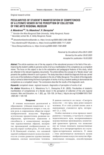 Исследуется один из ключевых аспектов учебного процесса в области изобразительного искусства – совершенствование у студента способности восприятия художественных произведений как проявление его компетенции грамотного зрителя. Нацеленность на этот аспект обусловлена содержательными и педагогическими особенностями данного исследования, которые нашли отражение в соответствующих нормативных документах. В статье дано определение понятия «грамотный зритель», представлены качества, которые присущи такому человеку. В исследовании подробно описана диагностика, которая была проведена в одном из учреждений высшего образования города Великий Новгород. Содержание диагностического исследования направлено на определение уровня восприятия произведений искусства студентом, стремящимся проявить свою компетенцию грамотного зрителя. В выводах описаны результаты диагностической работы.