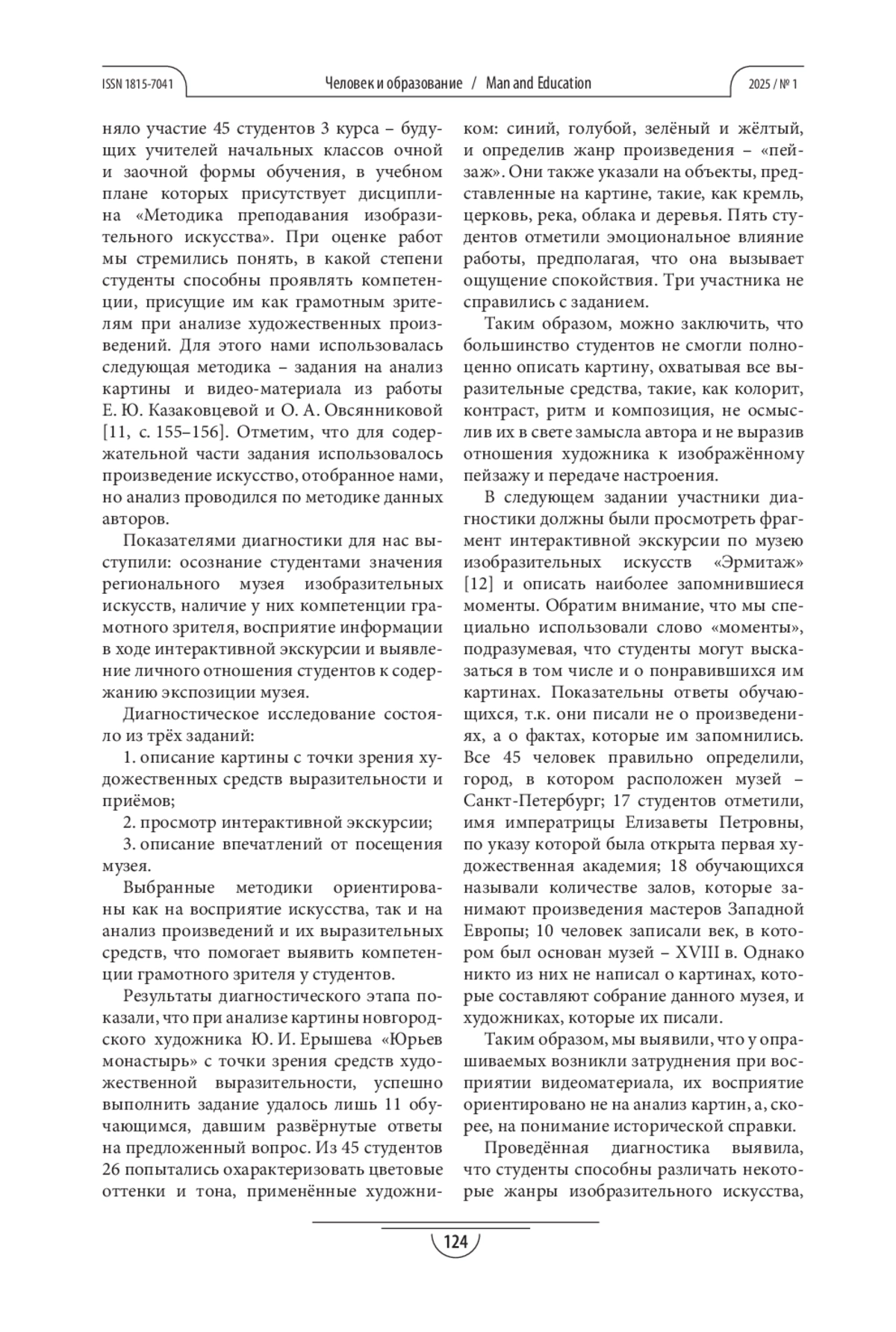 10. Казаковцева Е. Ю., Овсянникова О. А. Разработка диагностического инструментария исследования уровня развития художественного восприятия на занятиях по живописи // Проблемы современного педагогического образования. 2023. С. 154-157.
