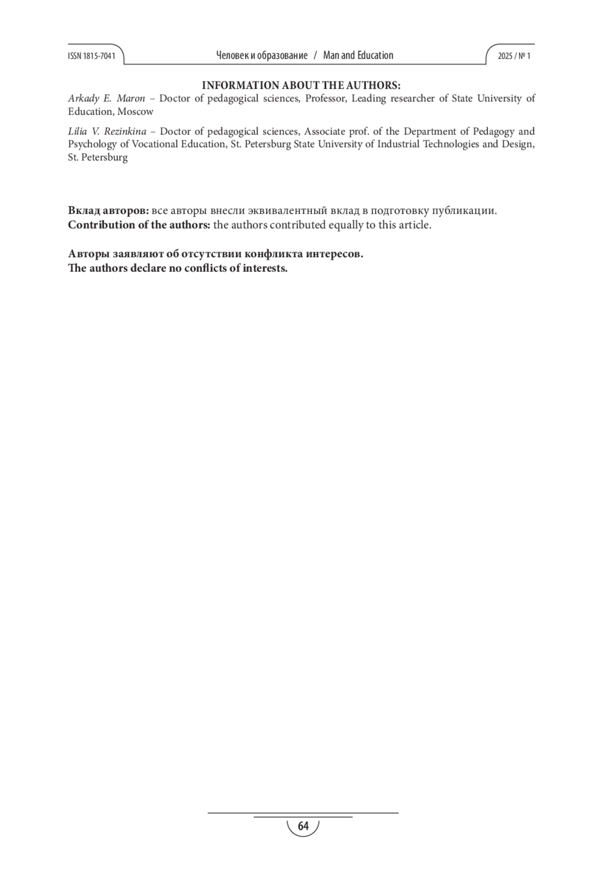 9. Резинкина Л. В., Марон А. Е. Муниципальная модель повышения качества непрерывного образования педагогических кадров // Человек и образование. 2019. № 1(58). С. 72-76.