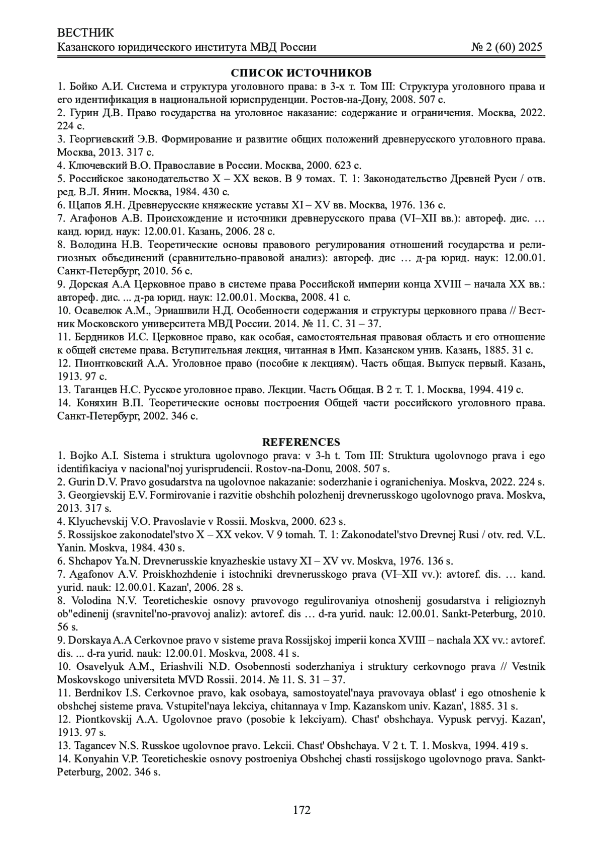 3. Георгиевский Э.В. Формирование и развитие общих положений древнерусского уголовного права. Москва, 2013. 317 с. EDN: RUUMZZ