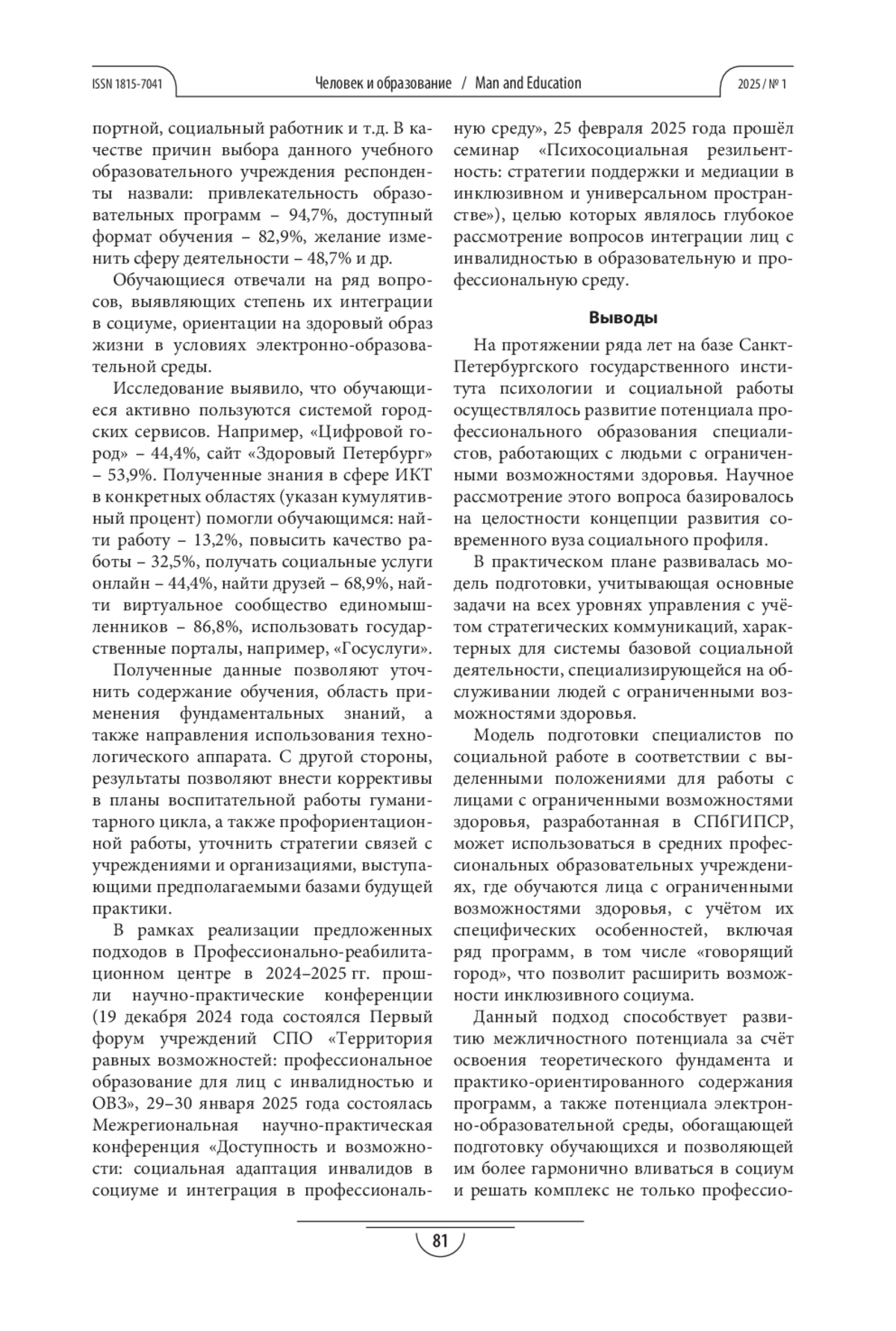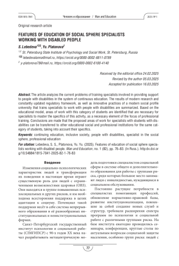 1. Кудрявцева М. Е., Лебедева С. С., Платонова Ю. Ю. Образование людей с инвалидностью в контексте использования стратегических коммуникаций в условиях неопределённости // Человек и образование. 2022. № 1(70). C. 81-90.
