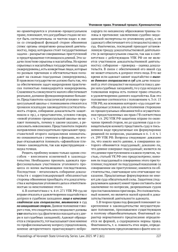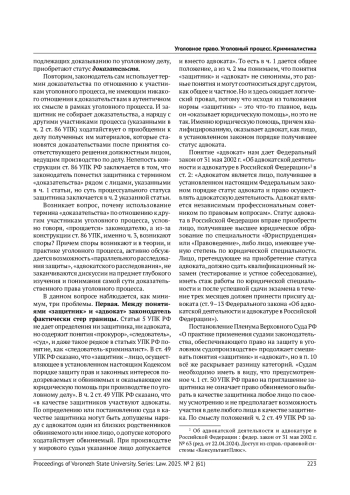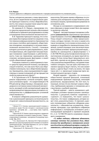 5. Ляхова А. И., Винникова Д. С. Полномочия адвоката-защитника по участию в собирании доказательств // Вызовы современности и стратегии развития общества в условиях новой реальности: материалы XVI Междунар. науч.-практ. конф. М., 2023.-С. 73-79. EDN: XKORWA