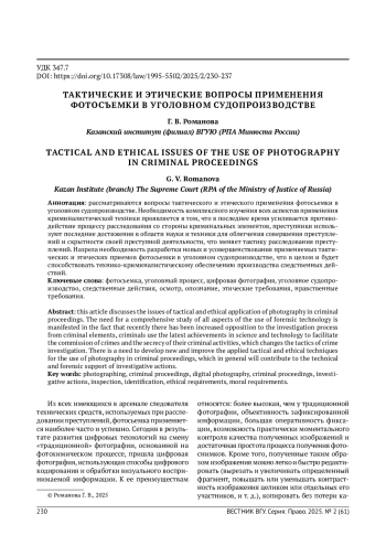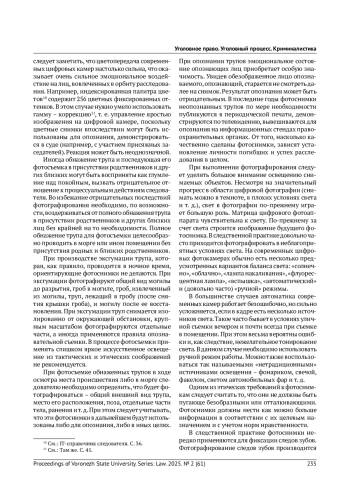 5. Романов В. И. Современные представления о сущности и основных направлениях деятельности криминалистической (судебной) фотографии // Криминалистическое обеспечение расследования преступлений: проблемы, перспективы и инновации: материалы Междунар. науч.-практ. конф. Минск: Издат. центр БГУ, 2017. С. 32-34. EDN: URVEJT