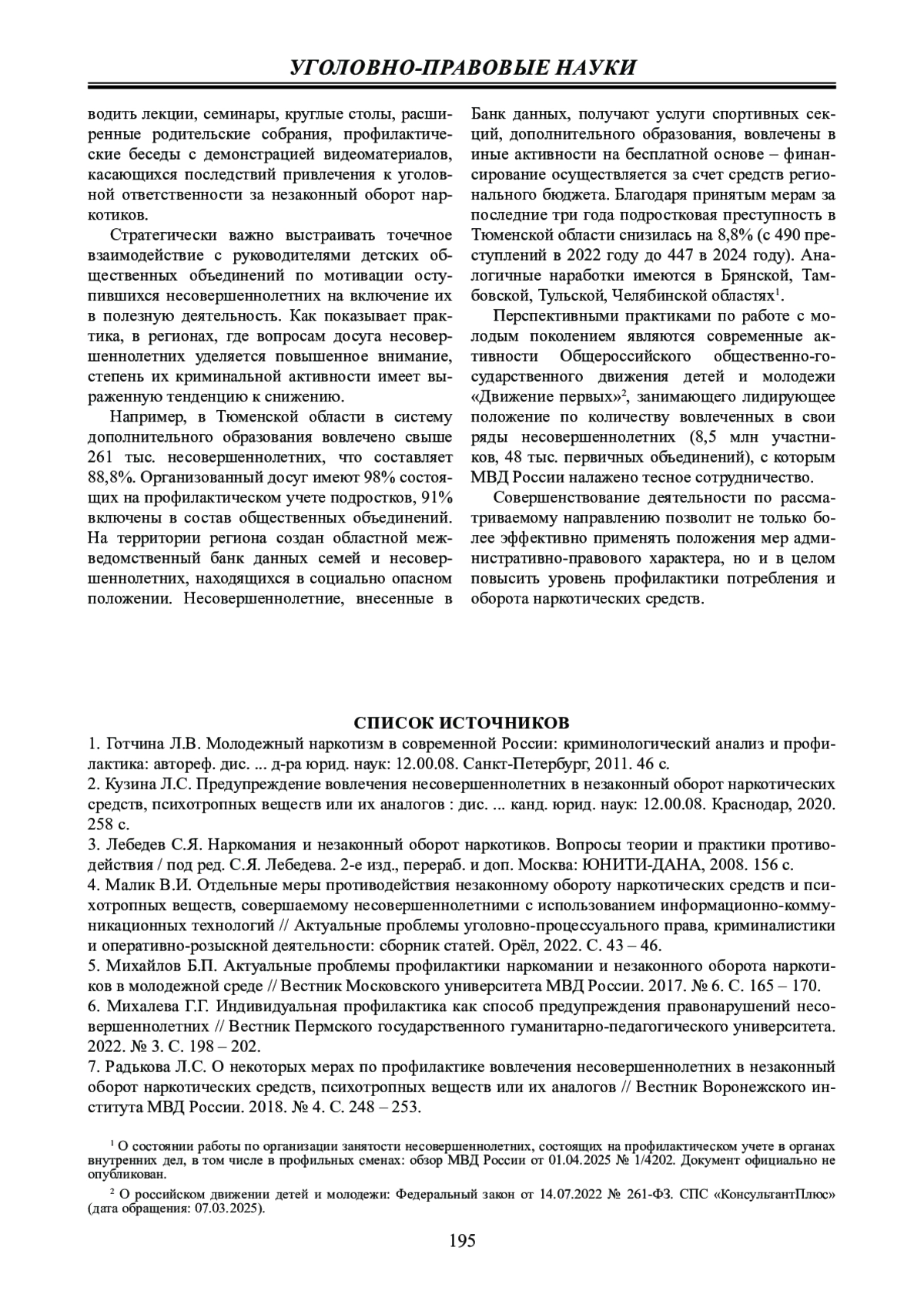1. Готчина Л.В. Молодежный наркотизм в современной России: криминологический анализ и профилактика: автореф. дис.... д-ра юрид. наук: 12.00.08. Санкт-Петербург, 2011. 46 с. EDN: ZOHUWL