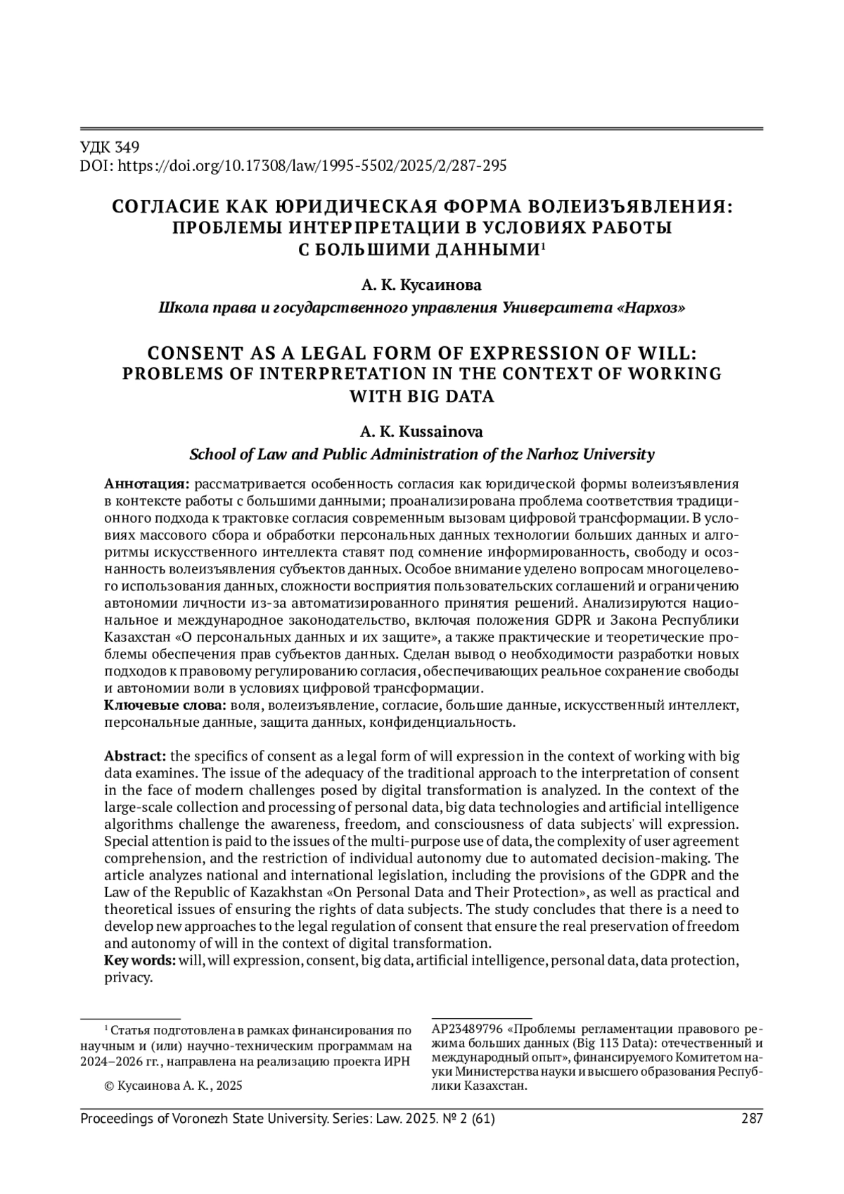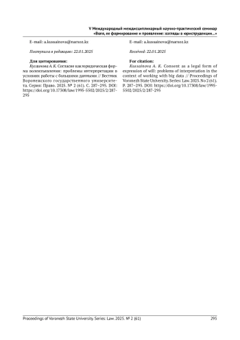 Рассматривается особенность согласия как юридической формы волеизъявления в контексте работы с большими данными; проанализирована проблема соответствия традиционного подхода к трактовке согласия современным вызовам цифровой трансформации. В условиях массового сбора и обработки персональных данных технологии больших данных и алгоритмы искусственного интеллекта ставят под сомнение информированность, свободу и осознанность волеизъявления субъектов данных. Особое внимание уделено вопросам многоцелевого использования данных, сложности восприятия пользовательских соглашений и ограничению автономии личности из-за автоматизированного принятия решений. Анализируются национальное и международное законодательство, включая положения GDPR и Закона Республики Казахстан «О персональных данных и их защите», а также практические и теоретические проблемы обеспечения прав субъектов данных. Сделан вывод о необходимости разработки новых подходов к правовому регулированию согласия, обеспечивающих реальное сохранение свободы и автономии воли в условиях цифровой трансформации.