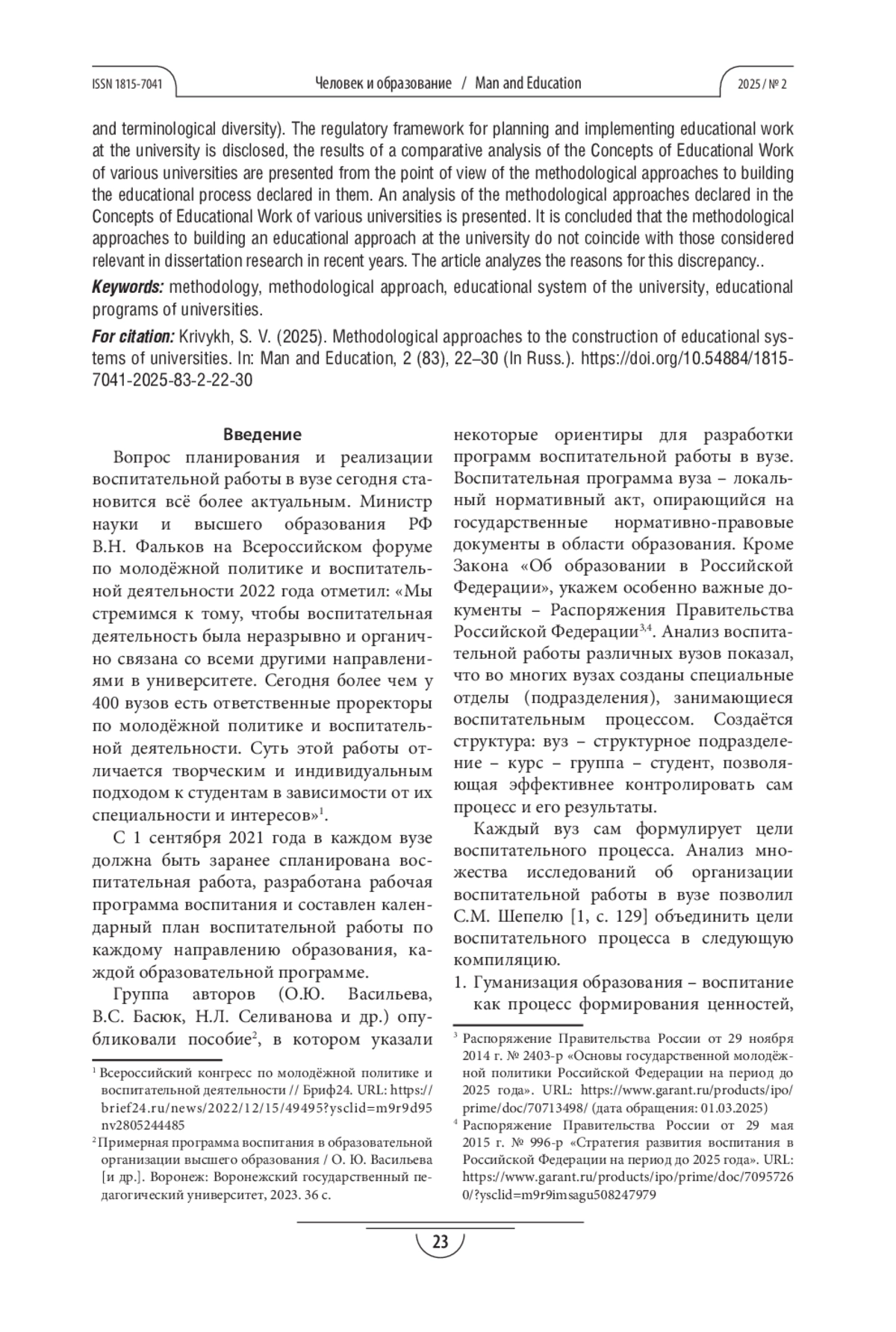 В статье представлен анализ понятий «методология» (возникновение, значение, уровни, подходы) и «методологический подход» (определения различных авторов, содержание, компонентный состав и терминологическое многообразие). Раскрыто нормативное обеспечение планирования и реализации воспитательной работы в вузе, представлены результаты сравнительного анализа Концепций воспитательной работы различных вузов с точки зрения заявленных в них методологических подходов к построению воспитательного процесса. Представлен анализ методологических подходов, заявляемых в Концепциях воспитательной работы различных вузов. Сделан вывод о том, что методологические подходы к построению воспитательного подхода в вузе не совпадают с теми, которые считаются актуальными в диссертационных исследованиях последних лет. В статье анализируются причины этого несовпадения.