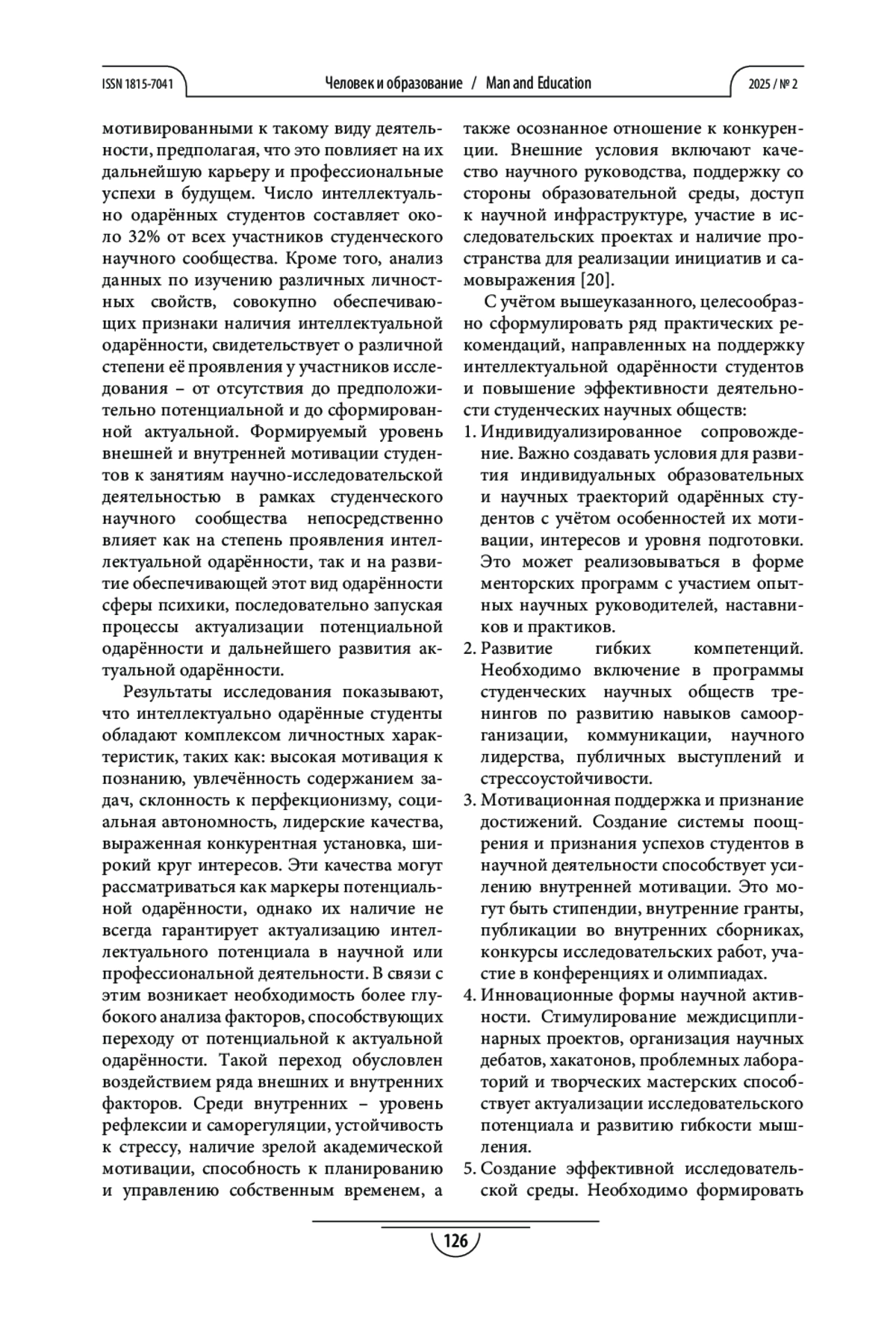 В статье представлены результаты исследования, целью которого является изучение особенностей развития интеллектуальной одарённости студентов в рамках деятельности студенческого научного сообщества. Рассматриваются вопросы проявления отдельных свойств психики, совокупно обеспечивающих развитие интеллектуальной одарённости у студентов, занимающихся научно-исследовательской деятельностью в период их участия в работе студенческого научного сообщества. Данные, собранные из научных публикаций в электронных базах (Российская государственная библиотека, eLibrary, Web of Science и Scopus), служат основой для анализа теоретических аспектов рассматриваемой проблемы. Результатом исследования стало выявление у студентов, занимающихся научно-исследовательской деятельностью в студенческом научном сообществе, уровня развития личностных характеристик, совокупно обеспечивающих степень проявления интеллектуальной одарённости в процессе её развития, признаков наличия как потенциальной, так и актуальной интеллектуальной одарённости, различающихся по степени выраженности. Установлена связь между личностными характеристиками, уровнем мотивации к научно-исследовательской деятельности и проявлениями интеллектуальной одарённости, что позволяет рассматривать участие в научном сообществе как фактор, способствующий её актуализации и развитию. Полученные данные легли в основу практических рекомендаций, направленных на поддержку интеллектуальной одарённости студентов и повышение эффективности деятельности студенческих научных обществ.