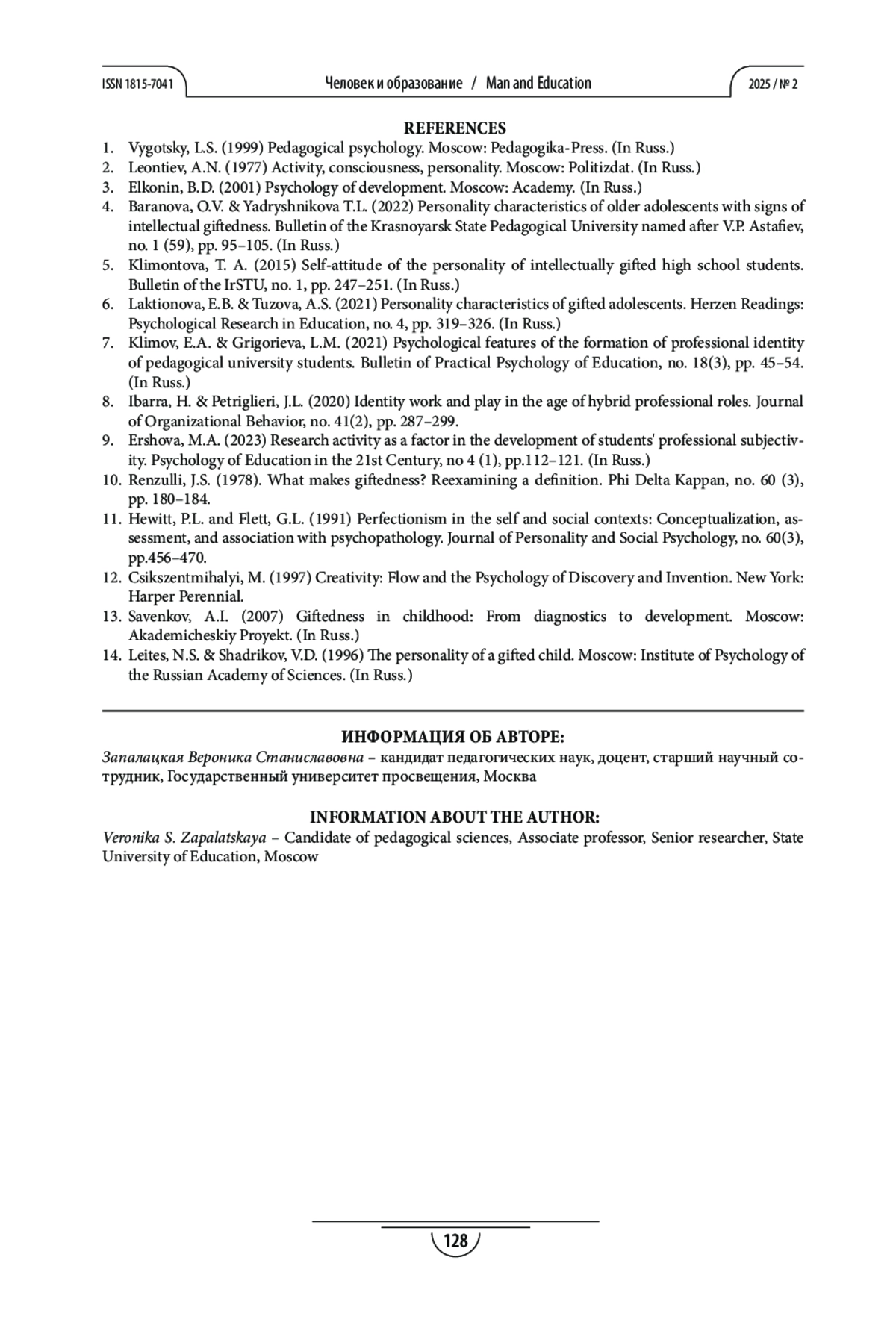 7. Климов Е.А., Григорьева,Л.М. Психологические особенности формирования профессиональной идентичности студентов педагогического вуза // Вестник практической психологии образования. 2021. № 18(3). С. 45-54.