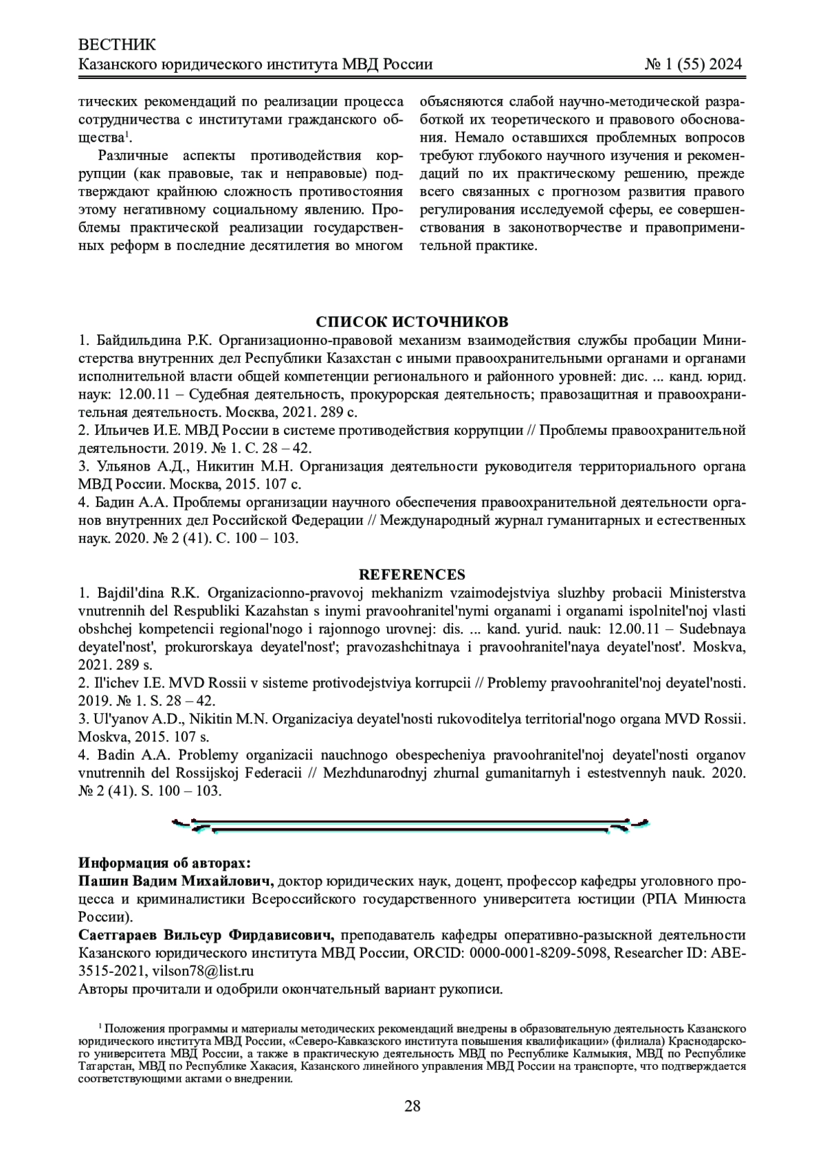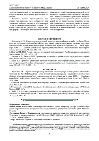2. Ильичев И.Е. МВД России в системе противодействия коррупции // Проблемы правоохранительной деятельности. 2019. № 1. С. 28 - 42. EDN: VWPDPJ