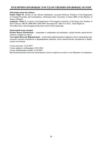 Материалы и методы: были использованы методы анализа, синтеза, дедукции и индукции. Материалами послужили нормативные правовые акты Российской Федерации, постановления Верховного Суда Российской Федерации, а также ведомственные приказы государственных органов. Обзор литературы: изучены научные труды Е. И. Галяшиной, Ж. Г. Ганеевой, А. В. Кутузова, А. Л. Осипенко.