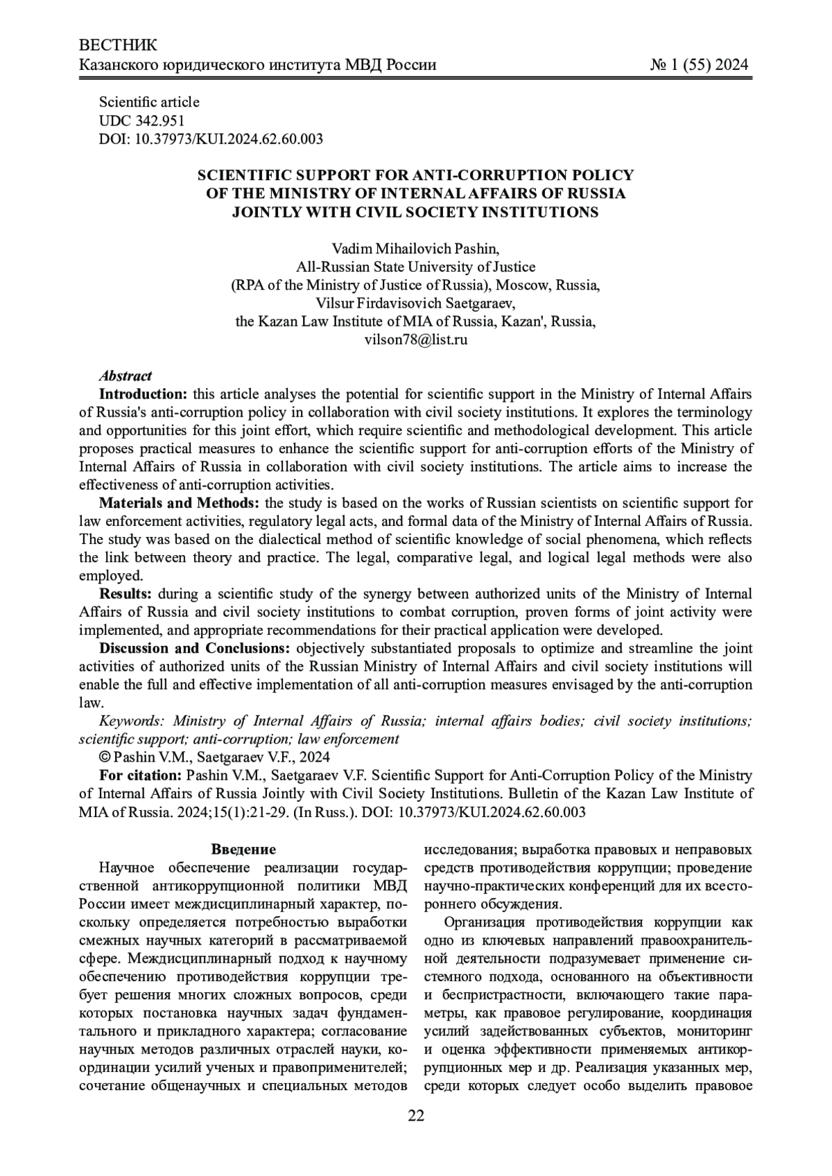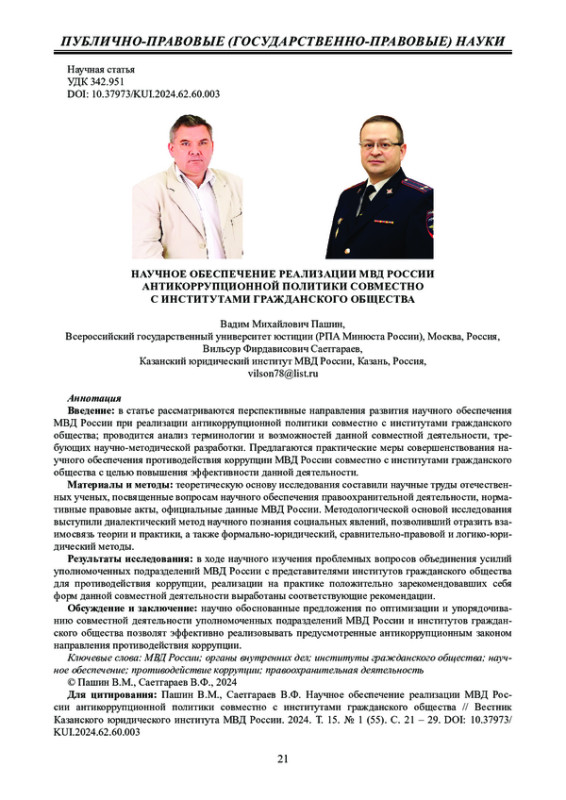 Обсуждение и заключение: научно обоснованные предложения по оптимизации и упорядочиванию совместной деятельности уполномоченных подразделений МВД России и институтов гражданского общества позволят эффективно реализовывать предусмотренные антикоррупционным законом направления противодействия коррупции.