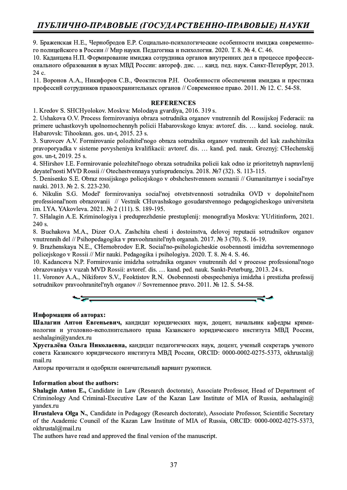9. Браженская Н.Е., Чернобродов Е.Р. Социально-психологические особенности имиджа современного полицейского в России // Мир науки. Педагогика и психология. 2020. Т. 8. № 4. С. 46. EDN: OZMAOP