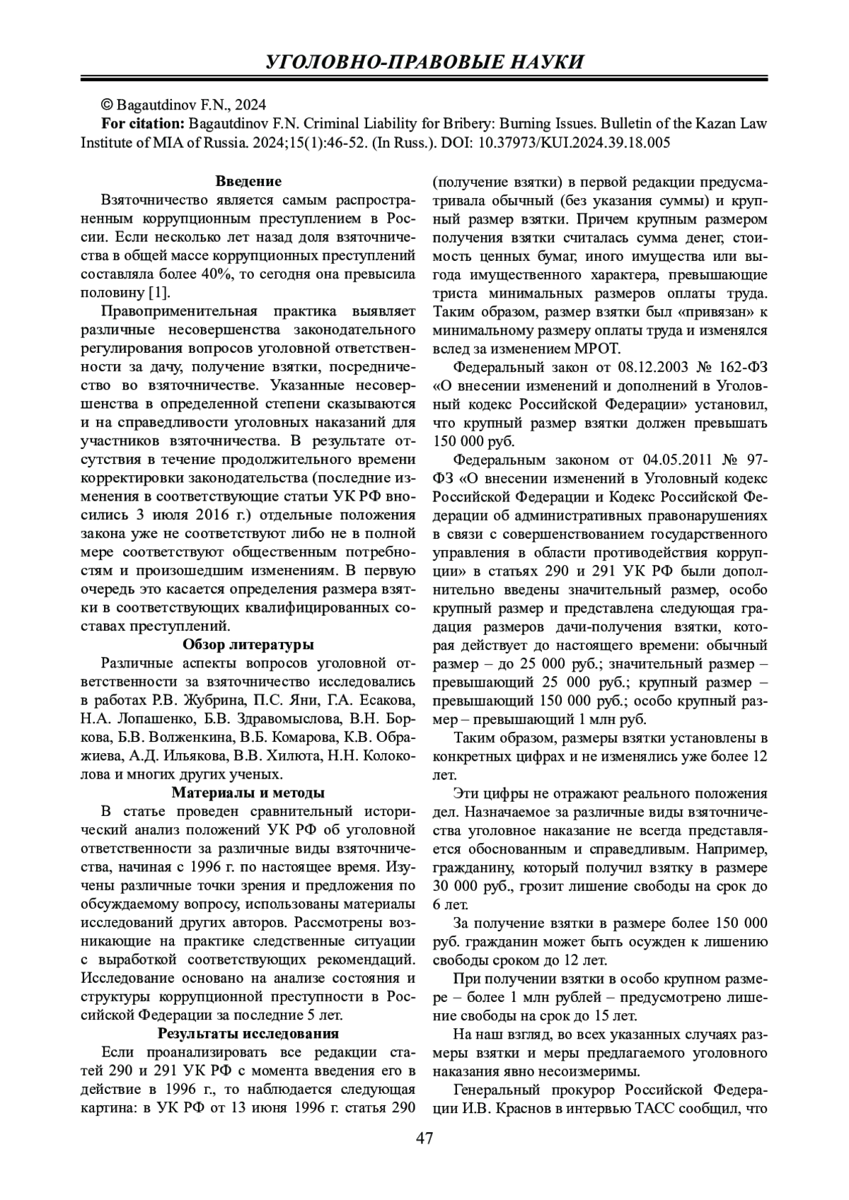 Результаты исследования: предложены изменения в действующие статьи Уголовного кодекса Российской Федерации, предусматривающие уголовную ответственность за взяточничество.