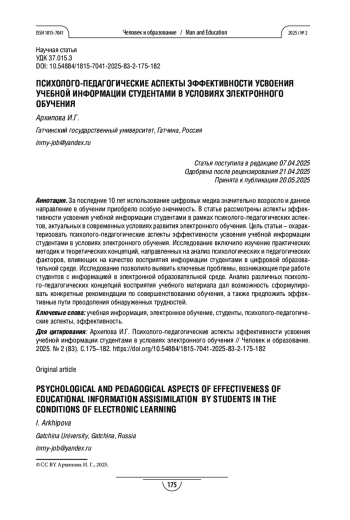 За последние 10 лет использование цифровых медиа значительно возросло и данное направление в обучении приобрело особую значимость. В статье рассмотрены аспекты эффективности усвоения учебной информации студентами в рамках психолого-педагогических аспектов, актуальных в современных условиях развития электронного обучения. Цель статьи – охарактеризовать психолого-педагогические аспекты эффективности усвоения учебной информации студентами в условиях электронного обучения. Исследование включило изучение практических методик и теоретических концепций, направленных на анализ психологических и педагогических факторов, влияющих на качество восприятия информации студентами в цифровой образовательной среде. Исследование позволило выявить ключевые проблемы, возникающие при работе студентов с информацией в электронной образовательной среде. Анализ различных психолого-педагогических концепций восприятия учебного материала дал возможность сформулировать конкретные рекомендации по совершенствованию обучения, а также предложить эффективные пути преодоления обнаруженных трудностей.
