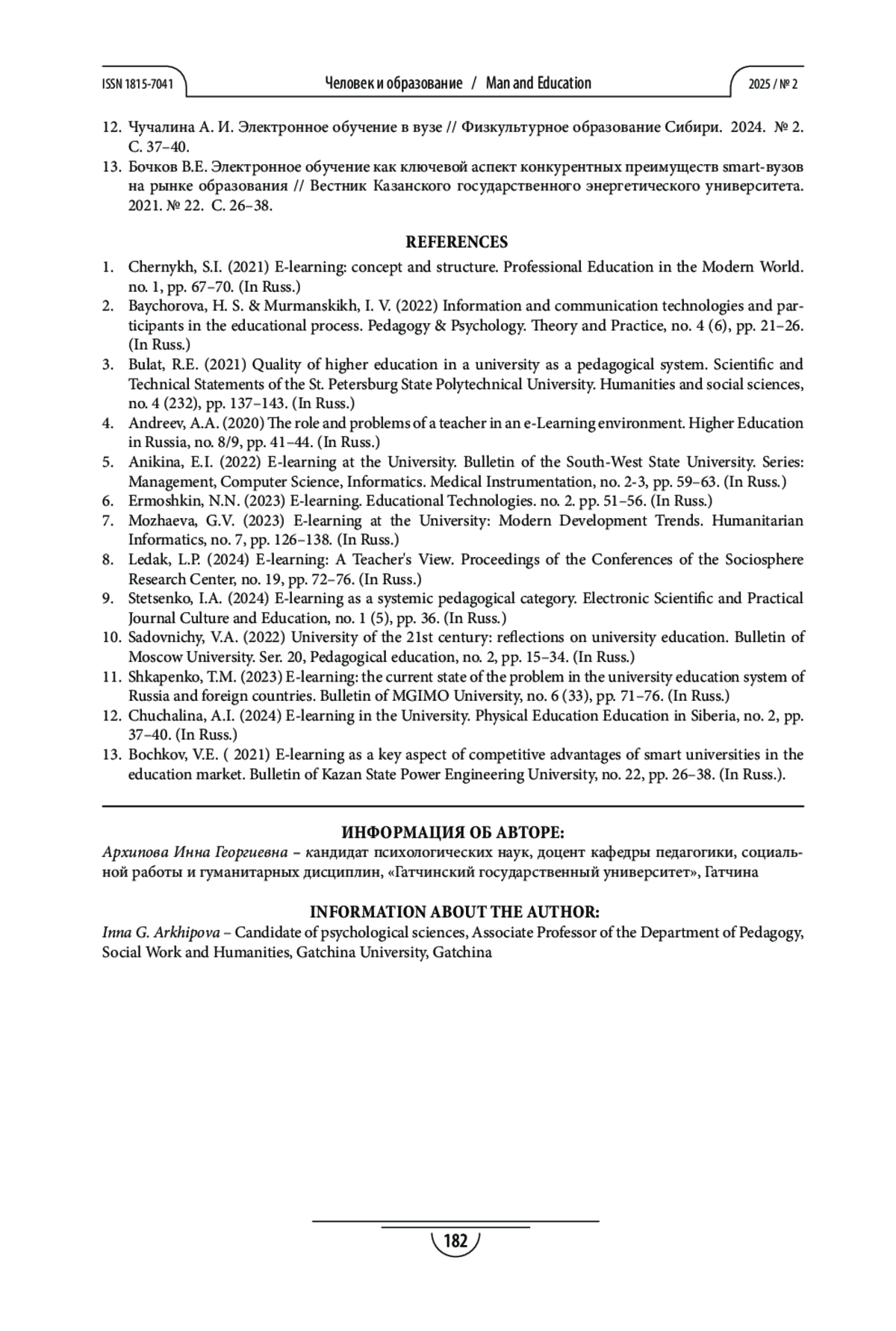 12. Чучалина А. И. Электронное обучение в вузе // Физкультурное образование Сибири. 2024. № 2. С. 37-40.