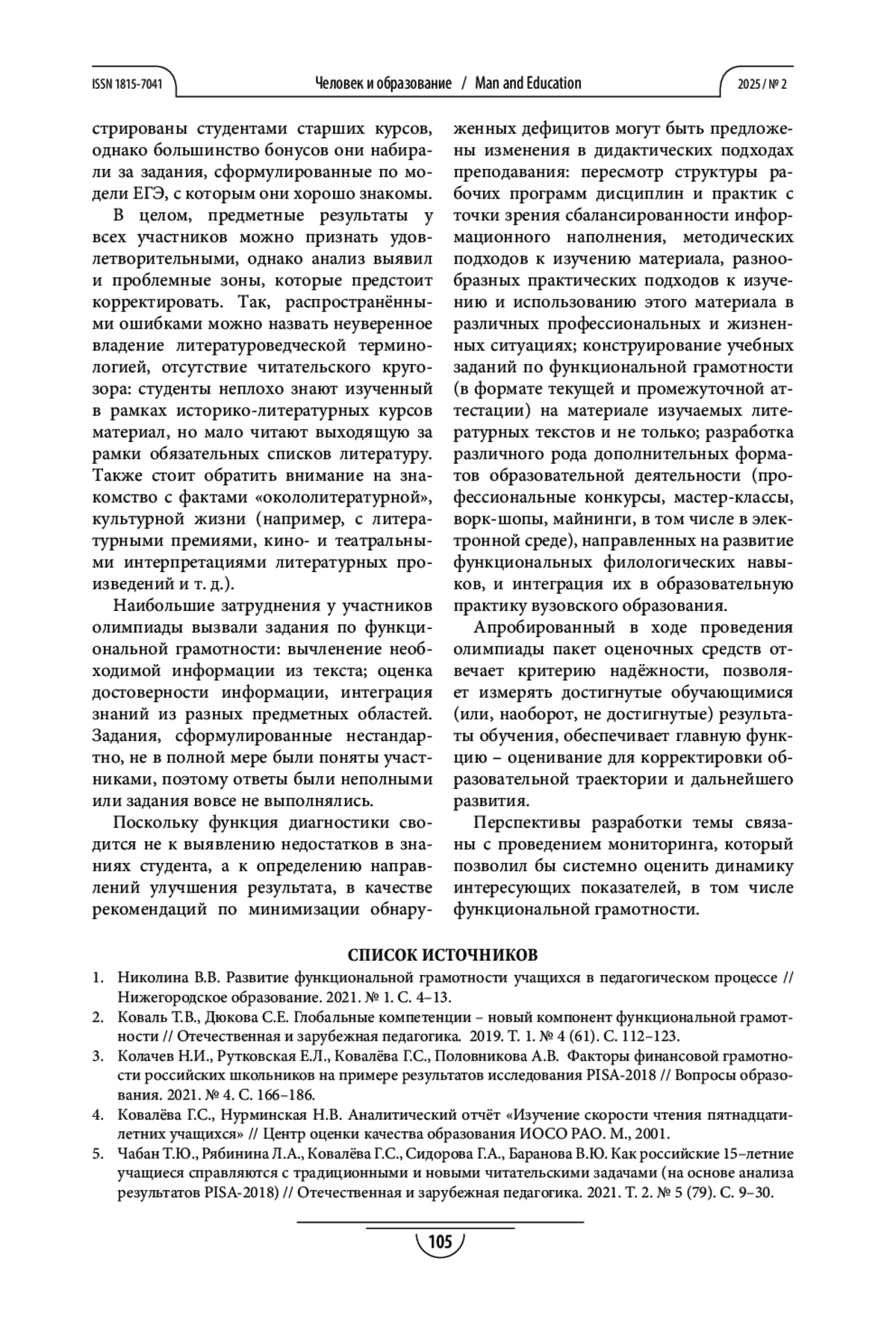 1. Николина В.В. Развитие функциональной грамотности учащихся в педагогическом процессе // Нижегородское образование. 2021. № 1. С. 4-13.