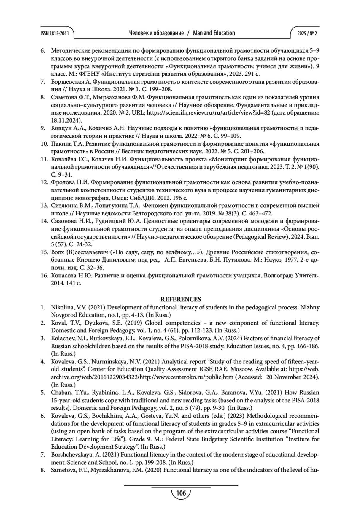 8. Саметова Ф.Т., Мырзаханова Ф.М. Функциональная грамотность как один из показателей уровня социально-культурного развития человека // Научное обозрение. Фундаментальные и прикладные исследования. 2020. № 2. URL: https://scientificreview.ru/ru/article/view?id=82 (дата обращения: 18.11.2024).