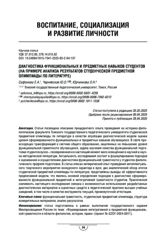 Статья посвящена описанию прецедентного опыта проведения на историко-филологическом факультете Томского государственного педагогического университета студенческой предметной олимпиады по литературе в качестве апробации диагностической модели оценки уровня сформированности функциональных и предметных навыков обучающихся. В свете происходящих трансформаций в системе общего образования, нацеленных на повышение уровня функциональной грамотности обучающихся, задача изучения качества функциональной подготовки студентов вузов – своевременная и в настоящий момент мало освещённая в научной и научно-методической литературе. Актуальность исследования состоит в формулировании подходов к оцениванию и осуществлении диагностики функциональной грамотности у студентов филологического профиля подготовки. В статье описан эмпирический опыт проведения интеллектуального творческого мероприятия конкурсного характера в вузе; дан аналитический обзор итогов студенческой предметной олимпиады по литературе; представлены выводы об эффективности предлагаемой модели, что явилось основой определения подходов к диагностике сформированности функциональной предметной и интегративной грамотности студентов. Практическая значимость настоящего исследования связана с возможностью использования разработанных диагностических материалов и оценочных средств в педагогической практике высших учебных заведений, в том числе в качестве инструмента текущей, промежуточной аттестации.