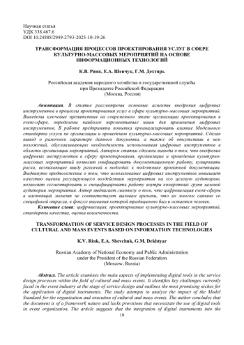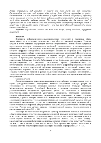 В статье рассмотрены основные аспекты внедрения цифровых инструментов в процессы проектирования услуг в сфере культурно-массовых мероприятий. Выведены ключевые препятствия на современном этапе организации проектирования в event-сфере, определены наиболее перспективные ниши для применения цифровых инструментов. В работе предпринята попытка проанализировать влияние Модельного стандарта услуги по организации и проведению культурно-массовых мероприятий. Сделан вывод о рамочном характере данного документа, а также об отсутствии в нем положений, обуславливающих необходимость использования цифровых инструментов в области организации мероприятий. Автором статьи сделаны выводы о том, что внедрение цифровых инструментов в сферу проектирования, организации и проведения культурно-массовых мероприятий позволит унифицировать документационную работу, купировать риски, возникающие ввиду различий в подходах к подготовке проектной документации. Выдвинуто предположение о том, что использование цифровых инструментов повышает качество оценки регулирующего воздействия мероприятия на его целевую аудиторию, позволяет сегментировать и специфицировать работу внутри конкретных групп целевой аудитории мероприятия. Автор выдвигает гипотезу о том, что цифровизация event-сферы в настоящий момент не соответствует вызовам времени, что во многом связано со спецификой отрасли, в фокусе внимания которой традиционно был и остается человек.