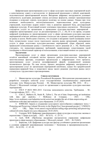 5. Сидоров, М.Н. Цифровая трансформация в сфере культуры и искусства: вызовы и перспективы // Сфера культуры. - 2023. - № 3(15). - С. 25-31.