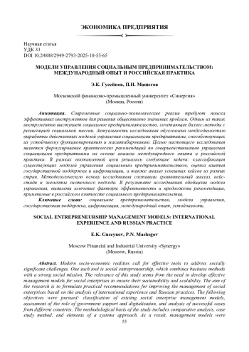 Современные социально-экономические реалии требуют поиска эффективных инструментов для решения общественно значимых проблем. Одним из таких инструментов выступает социальное предпринимательство, сочетающее бизнес-методы с реализацией социальной миссии. Актуальность исследования обусловлена необходимостью выработки действенных моделей управления социальными предприятиями, способствующих их устойчивому функционированию и масштабированию. Целью настоящего исследования является формулирование практических рекомендаций по совершенствованию управления социальными предприятиями на основе анализа международного опыта и российской практики. В рамках поставленной цели решались следующие задачи: классификация существующих моделей управления социальным предпринимательством, оценка влияния государственной поддержки и цифровизации, а также анализ успешных кейсов из разных стран. Методологическую основу исследования составили сравнительный анализ, кейс-стади и элементы системного подхода. В результате исследования обобщены модели управления, выявлены ключевые факторы эффективности и предложены рекомендации, применимые в российском контексте социального предпринимательства.