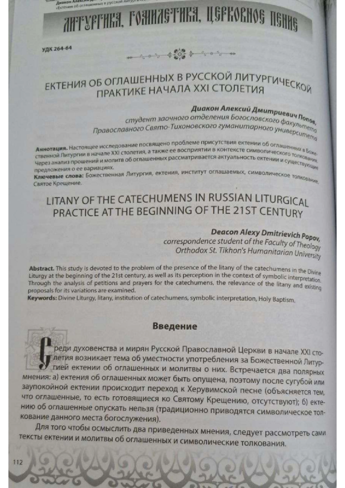Попов А., диак. Ектения об оглашенных в русской церковной традиции начала XXI в. // Вестник Омской духовной семинарии. - 2024. - №2 (17). - С.112-117.