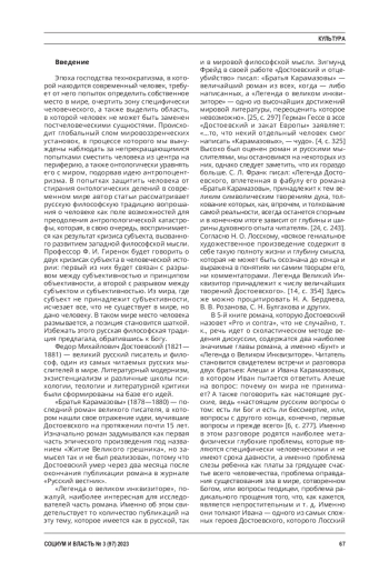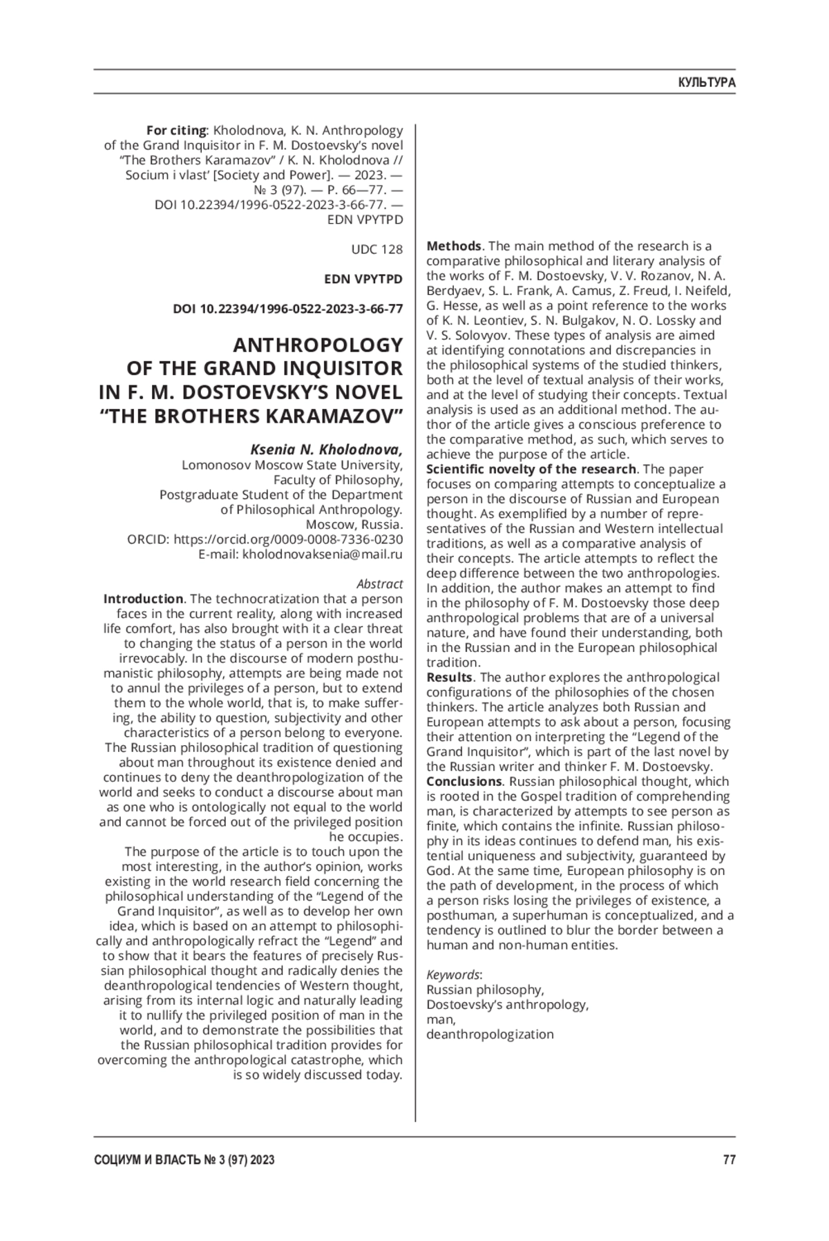 Цель. Целью данной статьи является попытка затронуть наиболее интересные, на взгляд автора, работы, существующие в мировом исследовательском поле, касающиеся философского понимания «Легенды о Великом инквизиторе», а также развить собственную мысль, в основе которой лежит попытка философско-антропологически преломить «Легенду…» и показать, что она несет в себе черты именно русской философской мысли и радикально отрицает деантропологические тенденции западной мысли, вытекающие из ее внутренней логики и закономерно приведшие ее к обнулению привилегированной позиции человека в мире, а также продемонстрировать возможности, которые предоставляет русская философская традиция для преодоления антропологической катастрофы, так широко обсуждаемой сегодня.