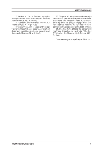 20. Чупров, А. С. Гегелевская концепция разума как преодоления помешательства / А. С. Чупров. - URL: https://topos.ru/article/ontologicheskie-progulki/gegelevskaya-koncepciya-razuma-kakpreodoleniya-pomeshatelstva (дата обращения: 08.08.2023).