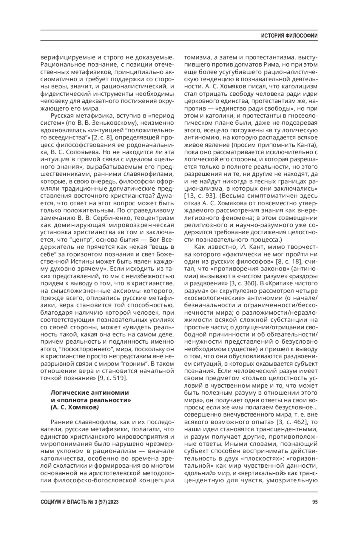 Введение. В статье анализируется проблема влияния философско-богословского творчества ранних славянофилов на русскую метафизику конца XIX - середины XX вв., рассматриваемую в качестве самобытного философского направления отечественной мысли. Цель. Авторами предпринимается попытка обоснования того, что в относительно небольших по общему объему трудах А. С. Хомякова и совсем немногих статьях И. В. Киреевского содержатся как удивительные философские прозрения, так и начальная разработка основных концептов, которые будут определять в будущем специфику русской метафизики. Методы. В качестве общефилософской методологии использовался персоналистский и герменевтический подходы, основная особенность которых состоит в утверждении свободно-творческой активности личности, способной, исходя из своих внутренних побуждений, изменять окружающую реальность, как социальную, так и природную. В исследовании применялись также общенаучные методы - анализ, синтез, сравнение, обобщение. Научная новизна исследования. Авторы акцентируют свое внимание на важнейшей для философии ранних славянофилов и последующей русской философии гносеологической компоненте - на идеале «цельного знания». По их мнению, концептуализация проблематики, связанной с критикой «самовластвующего рассудка» (И. В. Киреевский), стала необходимой и адекватной реакцией на происходившее в западноевропейской мысли гипертрофирование места и роли человеческого разума в познавательной деятельности. Результаты. В статье приводится аргументация в пользу того, что предпосылками для формирования идеала «цельного знания» у ранних славянофилов явились свойственные традиционному восточно-христианскому мировоззрению представления об отношении человека к сотворенному Богом миру, открытому для творчески-преобразовательной деятельности, при осуществлении которой следует стремиться к объединению познавательных усилий, как веры, так и разума. В широком историко-философском контексте славянофильская мысль продолжила на русской почве осмысление того феномена, который К. Ясперс определил как «осевое время», особенностью которого стал прорыв человеческого сознания в сферу трансцендентного. Именно в то время была открыта вера как способ познания непостижимого, а славянофилы внесли свой весомый вклад в ее осмысление.