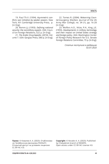 Выводы. На современном этапе развития мирового сообщества классификация войн существенно изменилась и расширилась. Это обстоятельство, в свою очередь, требует от государства изменения принципов обеспечения национальной безопасности, основанной на превентивных способах организации и практической реализации, устойчивой национальной идентичности, эффективной работе всех акторов национальной безопасности, стремлении к социально-экономической и политической стабильности.