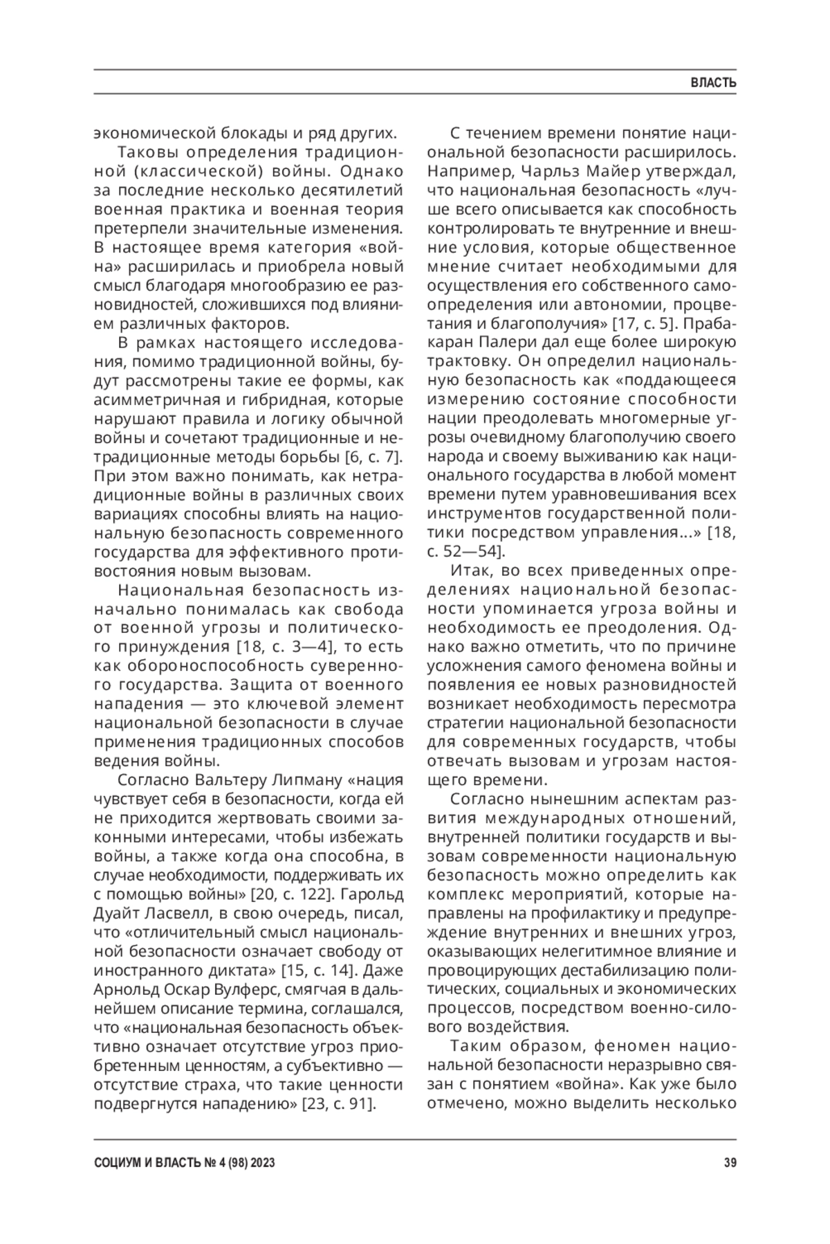 Введение. Война занимает особое место в развитии человечества, т. к. представляет собой неотъемлемую часть его истории. Проблема войны является предметом междисциплинарных исследований на протяжении всего периода становления социальных наук. Осмысление противоборства народов и отдельных социальных групп имеет место в философской мысли со времен возникновения первых крупных цивилизаций. На современном этапе развития общества проблематика войны тесно сопряжена с феноменом национальной безопасности, которая направлена на защиту государства от внутренних и внешних угроз и предупреждение рисков, посягающих на гармоничное развитие человека и общества, инфраструктуру, экономику, а также социально-политическое благополучие нации.