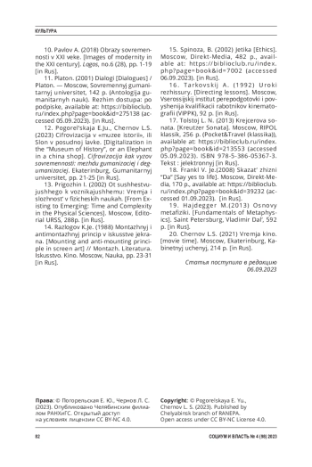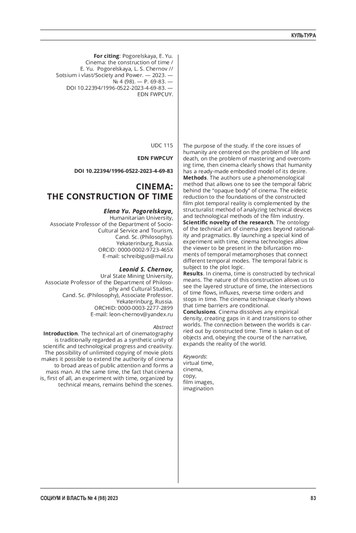 Методы. В работе используется феноменологический метод, позволяющий за «непрозрачным телом» кино видеть временную ткань. Эйдетическая редукция к основаниям сконструированной временной реальности киносюжетов дополняется структуралистским методом анализа технических устройств и технологических приемов кинопромышленности. Научная новизна. Онтология технического искусства кино выходит за грани рациональности и прагматики. Запуская особого рода эксперимент со временем, технологии кино позволяют присутствовать зрителю в бифуркационных моментах временных метаморфоз, соединяющих различные временные модусы. Временная ткань подчинена сюжетной логике.