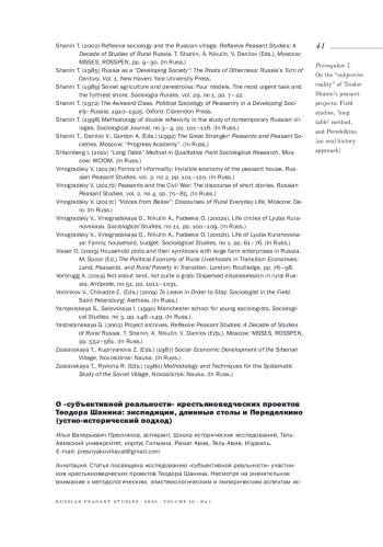 30. Shanin T. (2002) Reflexive sociology and the Russian village. Reflexive Peasant Studies: A Decade of Studies of Rural Russia. T. Shanin, A. Nikulin, V. Danilov (Eds.), Moscow: MSSES, ROSSPEN, pp. 9-30. (In Russ.).