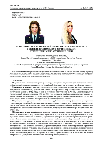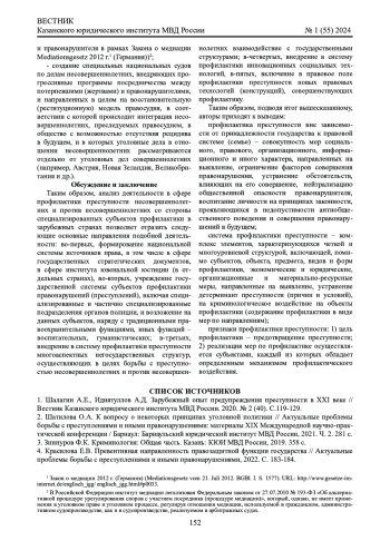 1. Шалагин А.Е., Идиятуллов А.Д. Зарубежный опыт предупреждения преступности в XXI веке // Вестник Казанского юридического института МВД России. 2020. № 2 (40). С.119-129. EDN: KWRFMW