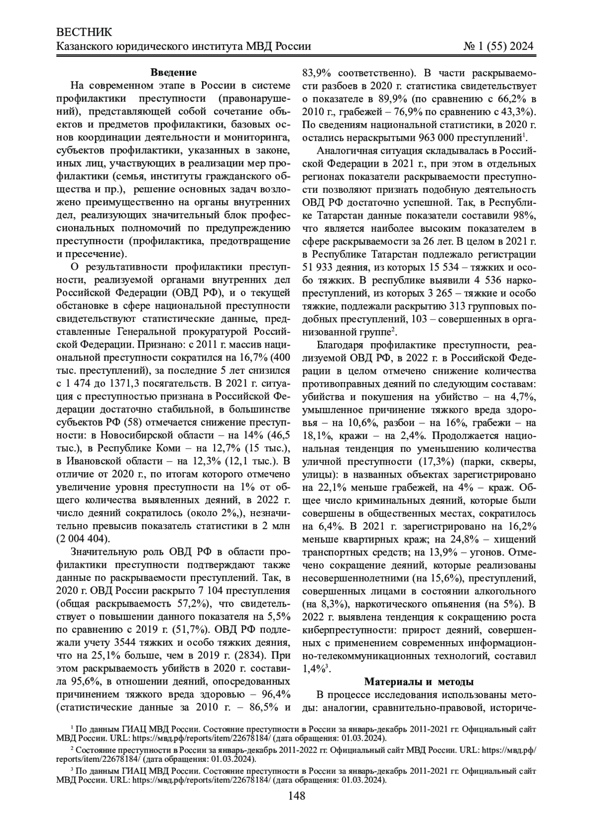 Материалы и методы: в процессе исследования использовались методы: аналогии, сравнительно-правовой, исторический, формальной логики. Эмпирическую базу исследования составили статистические данные ГИАЦ МВД России о состоянии преступности в России, Санкт-Петербурге и Ленинградской области в период с 2015 по 2023 год, результаты опубликованных эмпирических и социологических исследований, проведенных другими авторами, а также опубликованные статистические материалы по состоянию преступности в различных регионах России.