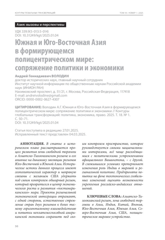 В статье в историческом плане рассматривается процесс развития зоны свободной торговли в Азиатско-Тихоокеанском регионе и его влияние на динамику эволюции регионов Юго-Восточной и Южной Азии. Исторические истоки данного процесса имеют геополитический характер и напрямую связаны с желанием США удержать под своим контролем обширный регион, который превратился в центр экономического роста и развития «постамериканского» мира. Проекты региональной экономической интеграции отражают, с одной стороны, естественное стремление стран двух регионов к более тесному горизонтальному взаимодействию и попытки неплатежеспособной американской экономики сохранить под своим контролем пространство, которое руководствуется своими национальными интересами, всё чаще расходящимися с политическими устремлениями официального Вашингтона, - с другой. В сложившихся условиях претерпевает изменения роль Индии в мировой и региональной политике. Предпринята попытка на фоне тектонических глобальных изменений оценить возможности укрепления российско-индийских отношений.