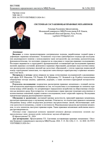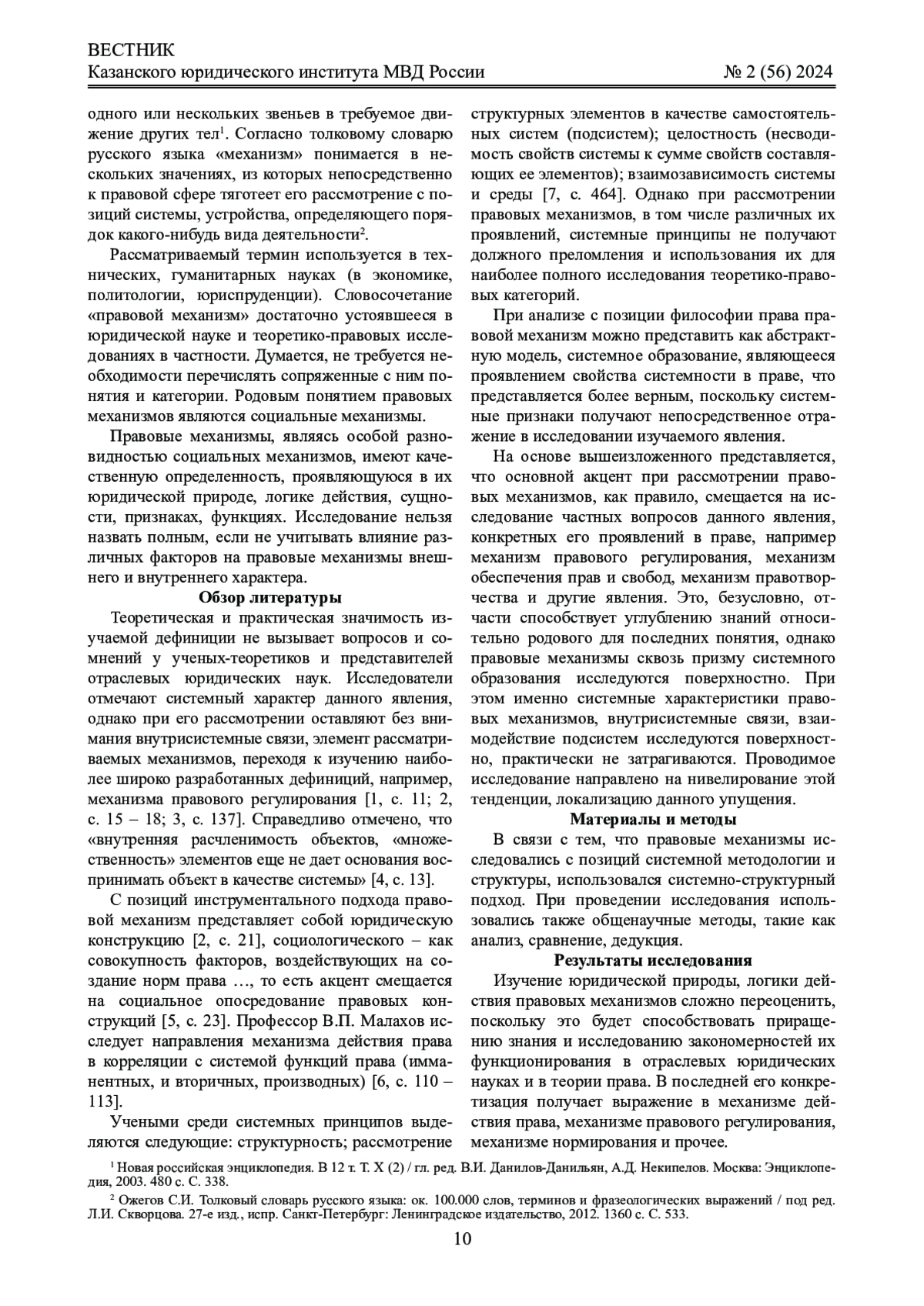 Введение: в статье проанализированы доктринальные подходы, выработанные теорией права к дефиниции «правовые механизмы». Установлено отсутствие единообразного подхода при исследовании анализируемого понятия с использованием таких методологий, как системная, аксиологическая, феноменологическая, что негативно отражается на отраслевых и теоретико-правовых исследованиях. Последнее выражается в структурной и функциональной составляющей при исследовании правовых явлений, правовых состояний, феноменов и правовых образований, уделяющих недостаточное внимание рассмотрению изучаемых явлений как целостных образований, с учетом характера взаимосвязей между структурными элементами, что определяет качественную характеристику и правовых механизмов в том числе.