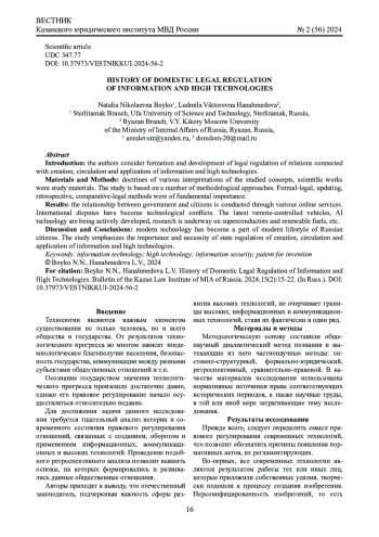 Введение: в статье рассматриваются вопросы формирования и развития правового регулирования отношений, связанных с созданием, оборотом и применением информационных и высоких технологий.