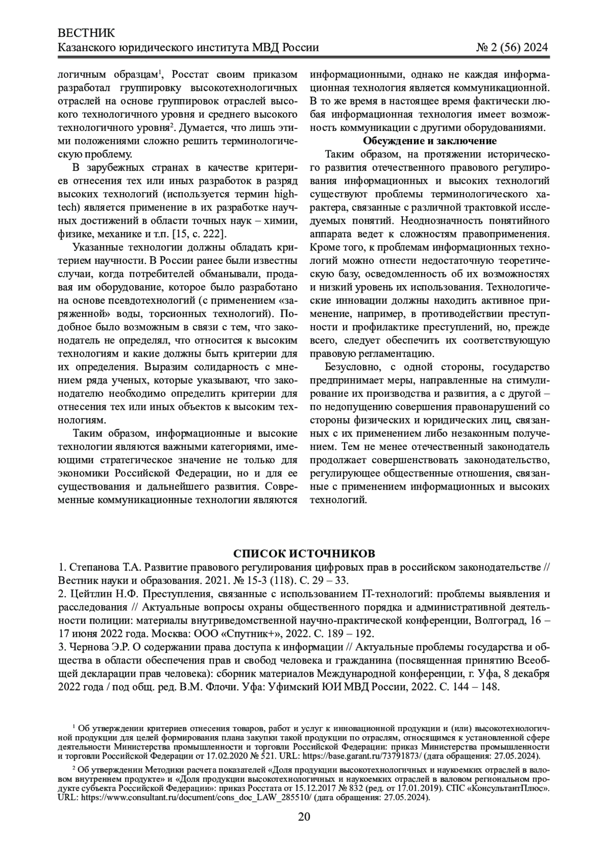 11. Киков Ш.М. О некоторых аспектах использования в отечественном законодательстве и юридической литературе термина “высокие технологии” // Вестник Московского университета МВД России. 2012. № 10. С. 183 - 185. EDN: PXKPCT