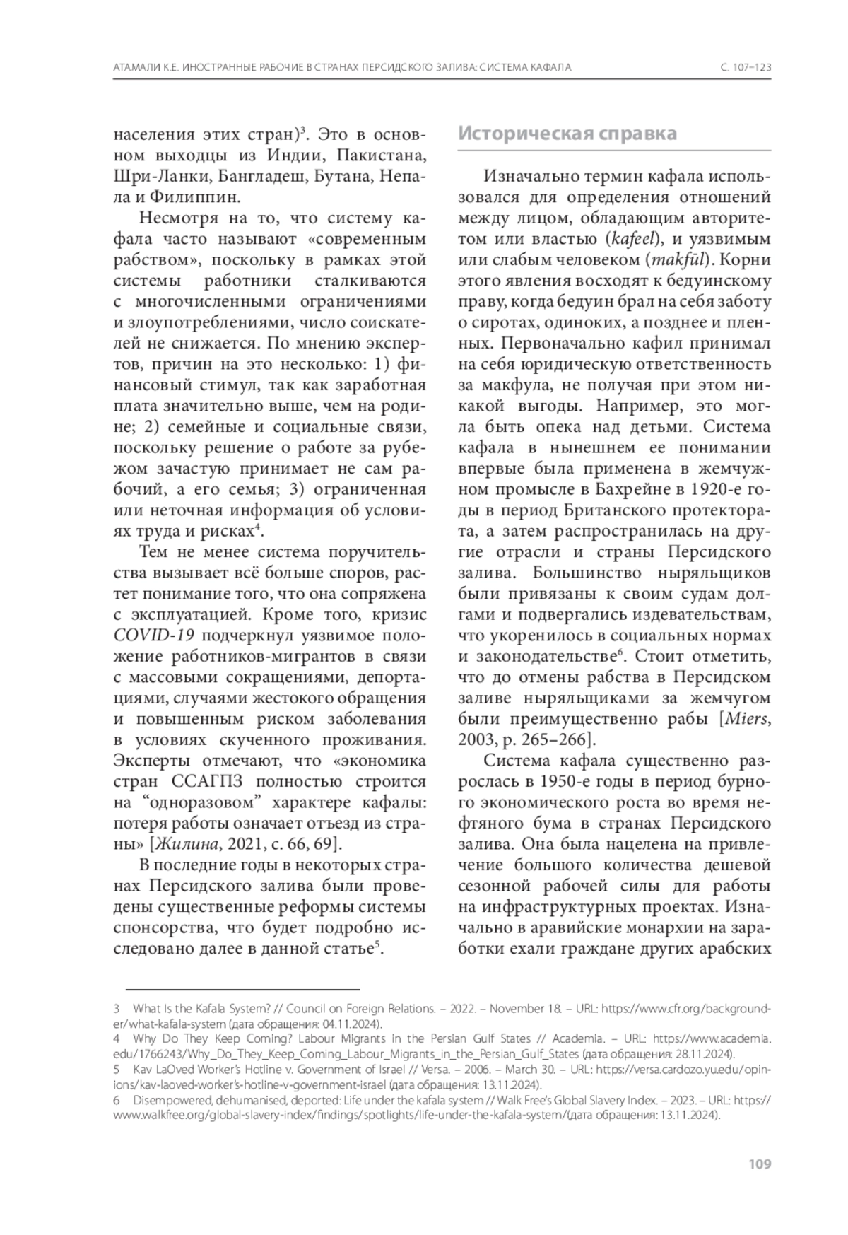 5. Семёнов И.А. Миграционная поли-тика стран - членов Совета сотрудничества арабских государств Персидского залива: общие и специфические черты // Актуальные вопросы миграции и возможности межрегионального международного сотрудничества : сборник статей по результатам Международной научно-практической конференции. - Тюмень, 2023. - С. 140-148.