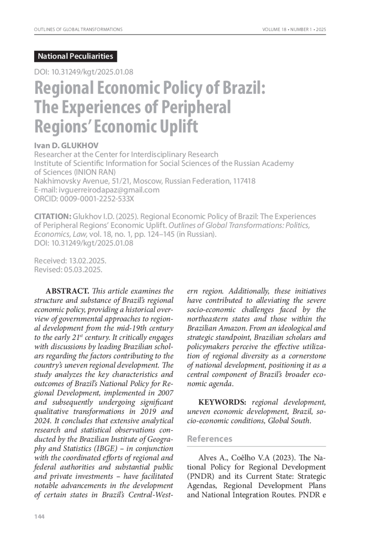 В статье рассматриваются структура и содержание региональной экономической политики Бразилии. Приводится краткий исторический обзор подходов бразильских властей к региональному развитию с середины XIX до начала XXI в. Рассмотрена дискуссия ведущих бразильских исследователей о причинах неравномерности регионального развития «тропического гиганта». Проанализированы основные характеристики и результаты Национальной политики регионального развития Бразилии, реализуемой с 2007 г. и прошедшей значительные качественные трансформации в 2019 и 2024 гг. Сделан вывод о том, что многолетние аналитические изыскания и статистические наблюдения Бразильского института географии и статистики вкупе с координацией усилий региональных и федеральных властей и значительными бюджетными и частными вложениями позволили добиться успехов в развитии отдельных штатов Центрально-Западного региона Бразилии, а также смягчить остроту тяжелого социально-экономического положения на северо-востоке страны и в штатах бразильской Амазонии. Показано, что с идейно-ценностной точки зрения эффективное использование регионального разнообразия воспринимается бразильскими учеными и политическими деятелями в качестве одного из ведущих проектов развития «тропического гиганта».