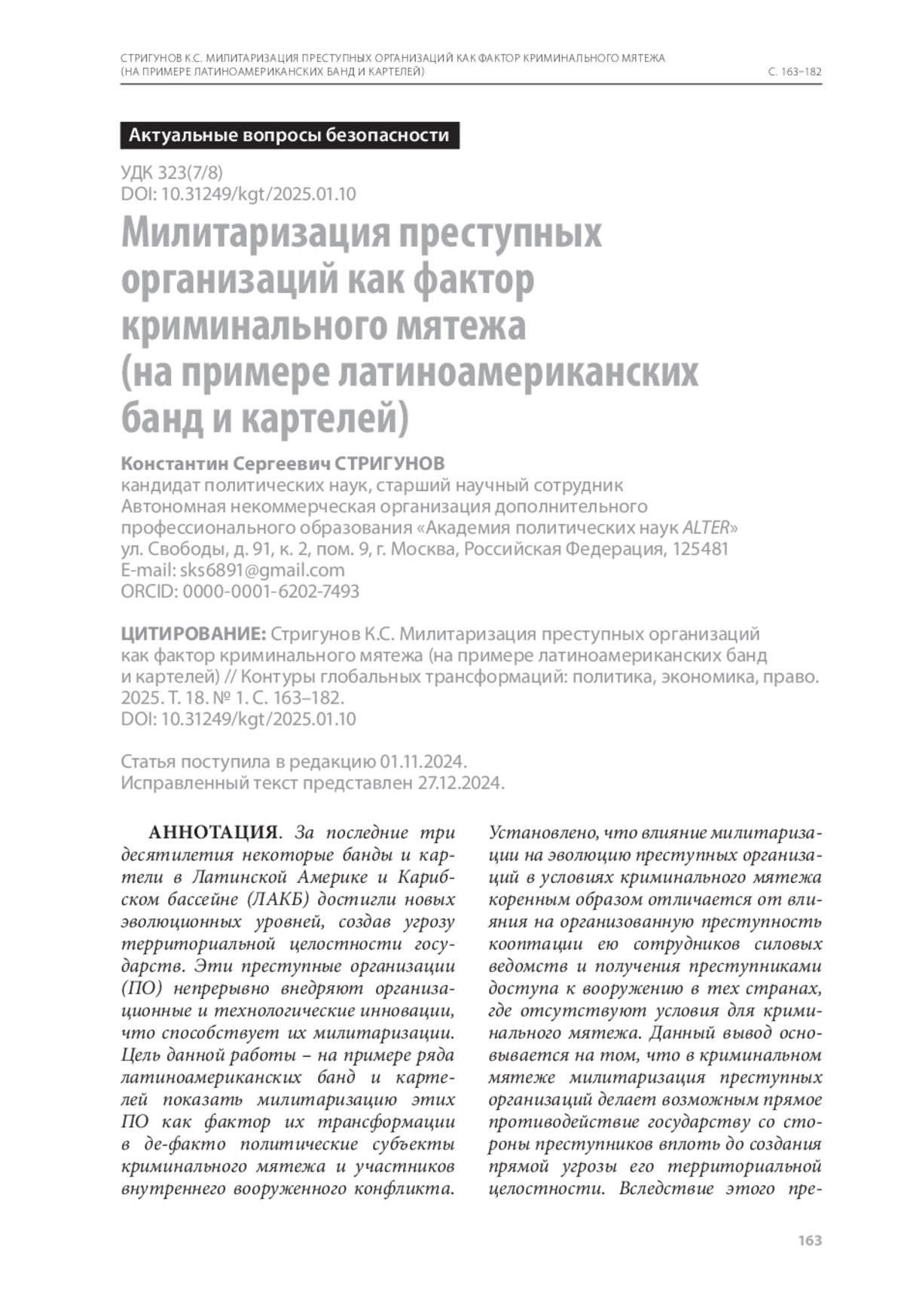 За последние три десятилетия некоторые банды и картели в Латинской Америке и Карибском бассейне (ЛАКБ) достигли новых эволюционных уровней, создав угрозу территориальной целостности государств. Эти преступные организации (ПО) непрерывно внедряют организационные и технологические инновации, что способствует их милитаризации. Цель данной работы на примере ряда латиноамериканских банд и картелей показать милитаризацию этих ПО как фактор их трансформации в де-факто политические субъекты криминального мятежа и участников внутреннего вооруженного конфликта. Установлено, что влияние милитаризации на эволюцию преступных организаций в условиях криминального мятежа коренным образом отличается от влияния на организованную преступность кооптации ею сотрудников силовых ведомств и получения преступниками доступа к вооружению в тех странах, где отсутствуют условия для криминального мятежа. Данный вывод основывается на том, что в криминальном мятеже милитаризация преступных организаций делает возможным прямое противодействие государству со стороны преступников вплоть до создания прямой угрозы его территориальной целостности. Вследствие этого преступные организации способны выступать в качестве де-факто политических субъектов, чем создаются условия для возникновения внутреннего вооруженного конфликта. Также выявлены основные типы милитаризации преступных организаций.