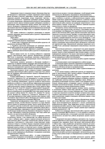 Ключевые фразы: САМОСТОЯТЕЛЬНАЯ РАБОТА, курсанты, саморазвитие обучающихся, учебно-воспитательный процесс, дисциплины специализации, ОБРАЗОВАТЕЛЬНЫЕ ОРГАНИЗАЦИИ МВД РОССИИ, педагогическая синергетика, ситуационно-средовой подход, самоорганизованность, методы самостоятельной работы