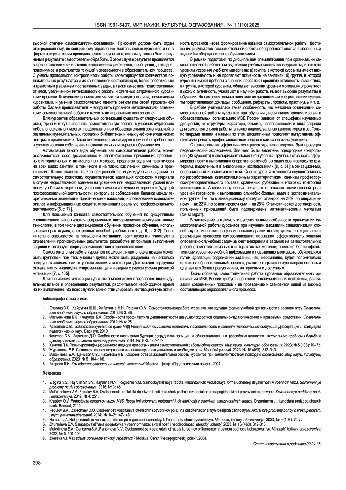 Статья: ОСОБЕННОСТИ САМОСТОЯТЕЛЬНОЙ РАБОТЫ КУРСАНТОВ В ОБРАЗОВАТЕЛЬНЫХ ОРГАНИЗАЦИЯХ МВД РОССИИ ПО СПЕЦИАЛЬНЫМ ДИСЦИПЛИНАМ (2025)