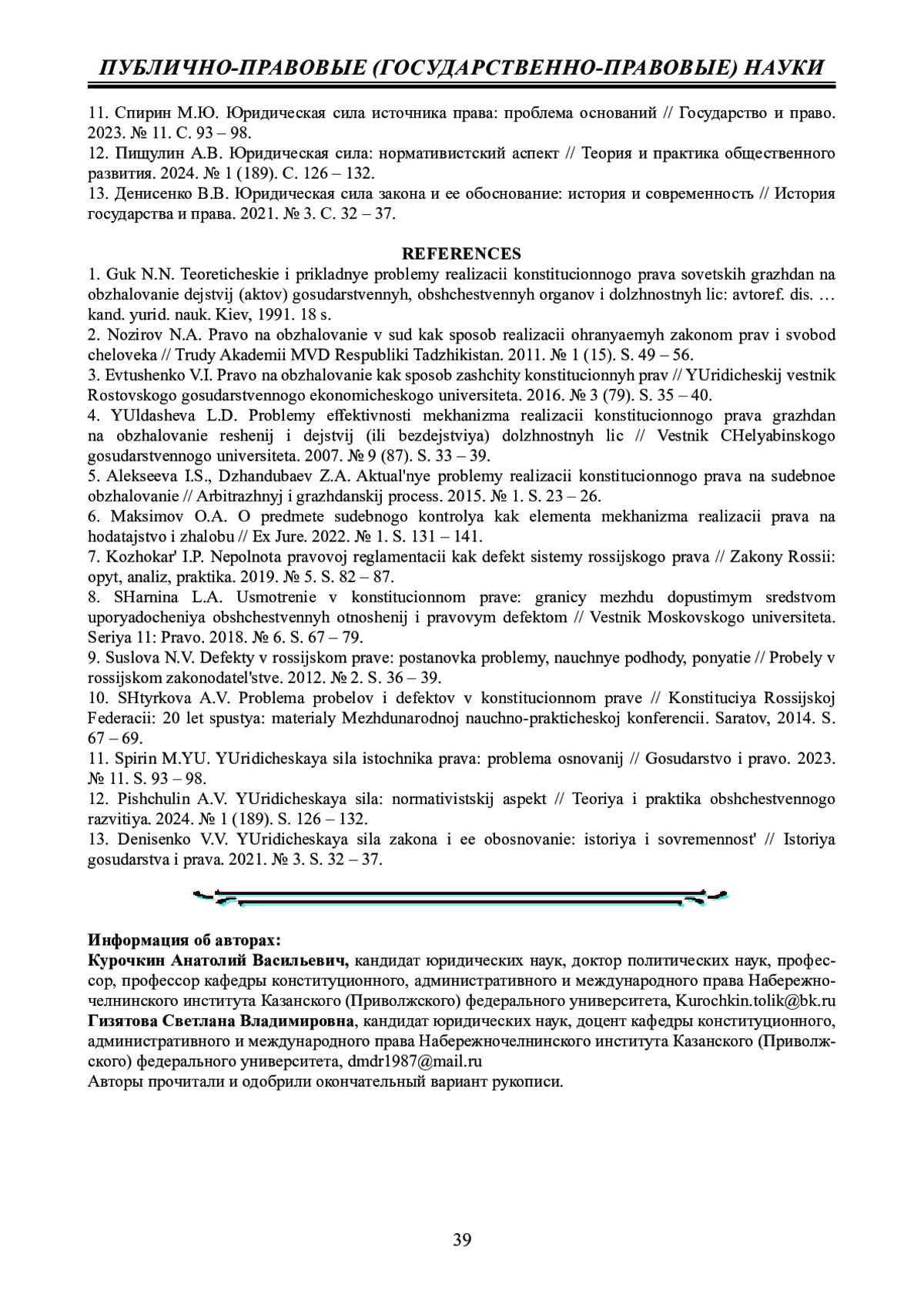 11. Спирин М.Ю. Юридическая сила источника права: проблема оснований // Государство и право. 2023. № 11. С. 93 - 98. EDN: RLIXXJ