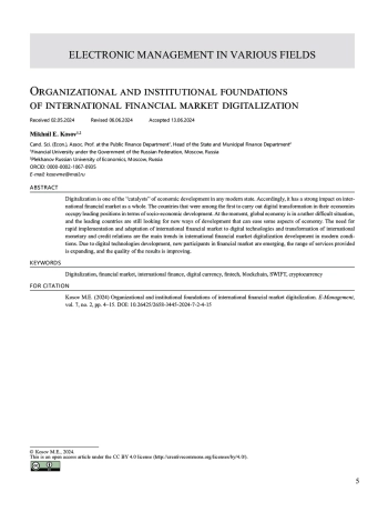 Цифровизация – один из «катализаторов» развития экономики в любом современном государстве. Соответственно, она имеет сильное влияние на международный финансовый рынок в целом. Страны, которые в числе первых начали проводить цифровую трансформацию в своей экономике, занимают лидирующие места по уровню социально-экономического развития. На данный момент мировая экономика находится в достаточно сложном положении, и лидирующие страны все еще ищут новые пути развития, которые смогут облегчить некоторые аспекты экономики. Необходимость быстрого внедрения и адаптации международного финансового рынка к цифровым технологиям и трансформация международных валютно-кредитных отношений – вот основные тенденции развития цифровизации международного финансового рынка в современных условиях. В связи с развитием цифровых технологий появляются новые участники финансового рынка, расширяется спектр оказываемых услуг, повышается качество получаемых результатов.