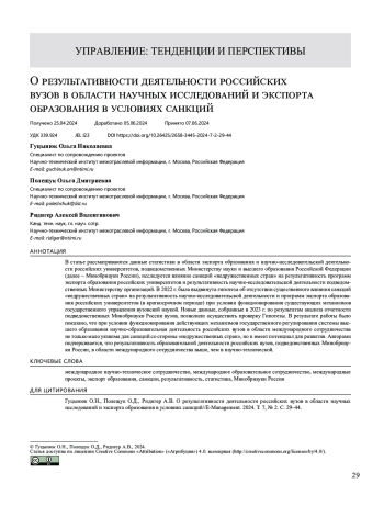 В статье рассматриваются данные статистики в области экспорта образования и научно-исследовательской деятельности российских университетов, подведомственных Министерству науки и высшего образования Российской Федерации (далее – Минобрнауки России), исследуется влияние санкций «недружественных стран» на результативность программ экспорта образования российских университетов и результативность научно-исследовательской деятельности подведомственных Министерству организаций. В 2022 г. была выдвинута гипотеза об отсутствии существенного влияния санкций «недружественных стран» на результативность научно-исследовательской деятельности и программ экспорта образования российских университетов (в краткосрочном периоде) при условии функционирования существующих механизмов государственного управления вузовской наукой. Новые данные, собранные в 2023 г. по результатам анализа отчетности подведомственных Минобрнауки России вузов, позволили осуществить проверку Гипотезы. В результате работы было показано, что при условии функционирования действующих механизмов государственного регулирования системы высшего образования научно-образовательная деятельность российских вузов в области международного сотрудничества не только мало уязвима для санкций со стороны «недружественных стран», но и имеет потенциал для развития. Авторами подчеркивается, что результативность образовательной деятельности российских вузов, подведомственных Минобрнауки России, в области международного сотрудничества выше, чем в научно-технической.