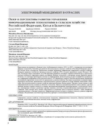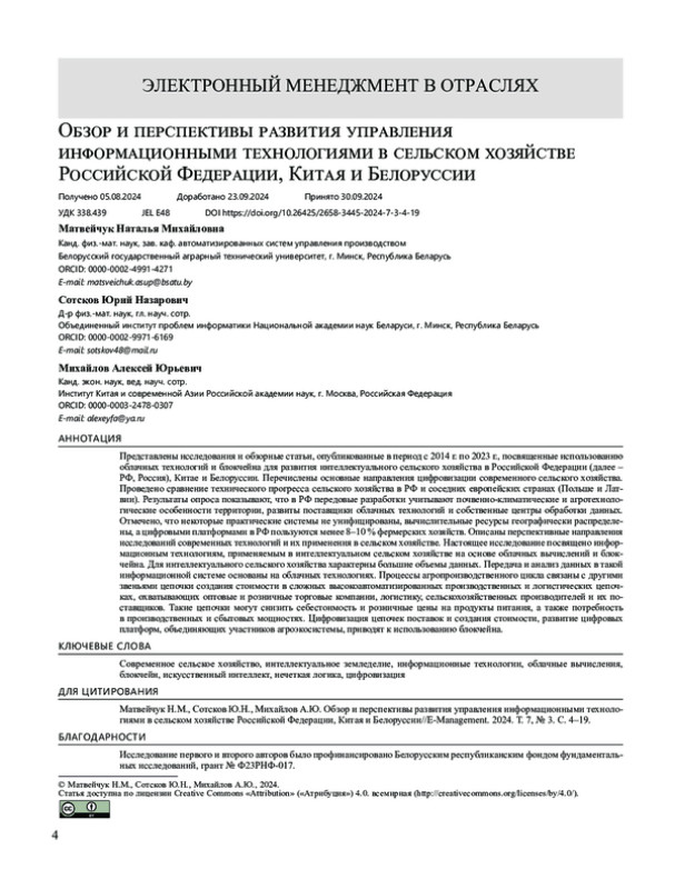Представлены исследования и обзорные статьи, опубликованные в период с 2014 г. по 2023 г., посвященные использованию облачных технологий и блокчейна для развития интеллектуального сельского хозяйства в Российской Федерации (далее – РФ, Россия), Китае и Белоруссии. Перечислены основные направления цифровизации современного сельского хозяйства. Проведено сравнение технического прогресса сельского хозяйства в РФ и соседних европейских странах (Польше и Латвии). Результаты опроса показывают, что в РФ передовые разработки учитывают почвенно-климатические и агротехнологические особенности территории, развиты поставщики облачных технологий и собственные центры обработки данных. Отмечено, что некоторые практические системы не унифицированы, вычислительные ресурсы географически распределены, а цифровыми платформами в РФ пользуются менее 8–10 % фермерских хозяйств. Описаны перспективные направления исследований современных технологий и их применения в сельском хозяйстве. Настоящее исследование посвящено информационным технологиям, применяемым в интеллектуальном сельском хозяйстве на основе облачных вычислений и блокчейна. Для интеллектуального сельского хозяйства характерны большие объемы данных. Передача и анализ данных в такой информационной системе основаны на облачных технологиях. Процессы агропроизводственного цикла связаны с другими звеньями цепочки создания стоимости в сложных высокоавтоматизированных производственных и логистических цепочках, охватывающих оптовые и розничные торговые компании, логистику, сельскохозяйственных производителей и их поставщиков. Такие цепочки могут снизить себестоимость и розничные цены на продукты питания, а также потребность в производственных и сбытовых мощностях. Цифровизация цепочек поставок и создания стоимости, развитие цифровых платформ, объединяющих участников агроэкосистемы, приводят к использованию блокчейна.
