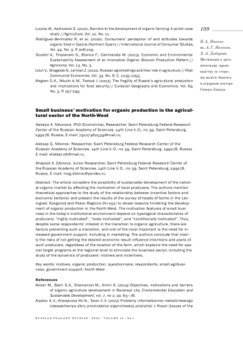 2. Виноградский В. Г., Виноградская О. Я., Никулина Е. С. (2020). Экология сельского мира как предмет социологического исследования // Крестьяноведение. Т. 5. № 1. С. 125-142. EDN: QOFVKM