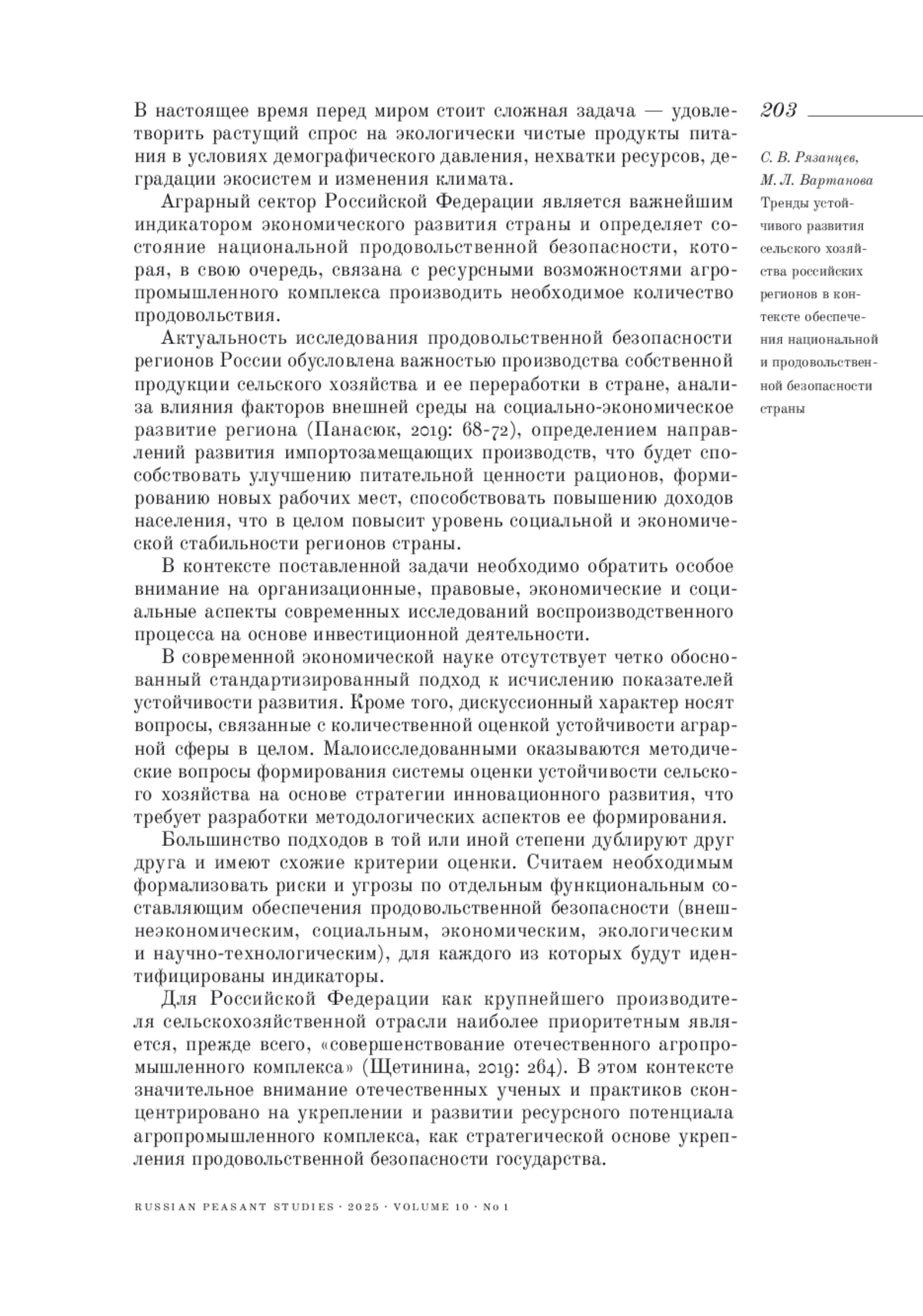 7. Вартанова М. Л. (2023). Стратегическое укрепление продовольственной безопасности регионов России в условиях обострения глобальных вызовов // Развитие экономических систем: теория, методология, практика: монография. Пенза: МНИЦ ПГАУ. С. 177-194. EDN: GDKKVG